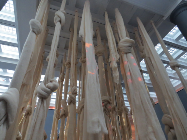 Cecilia Vicuña, Quipu desa-parecido, 2018, instalación multimedia en Brooklyn Museum, Nueva York. Fotografía cortesía de la autora.