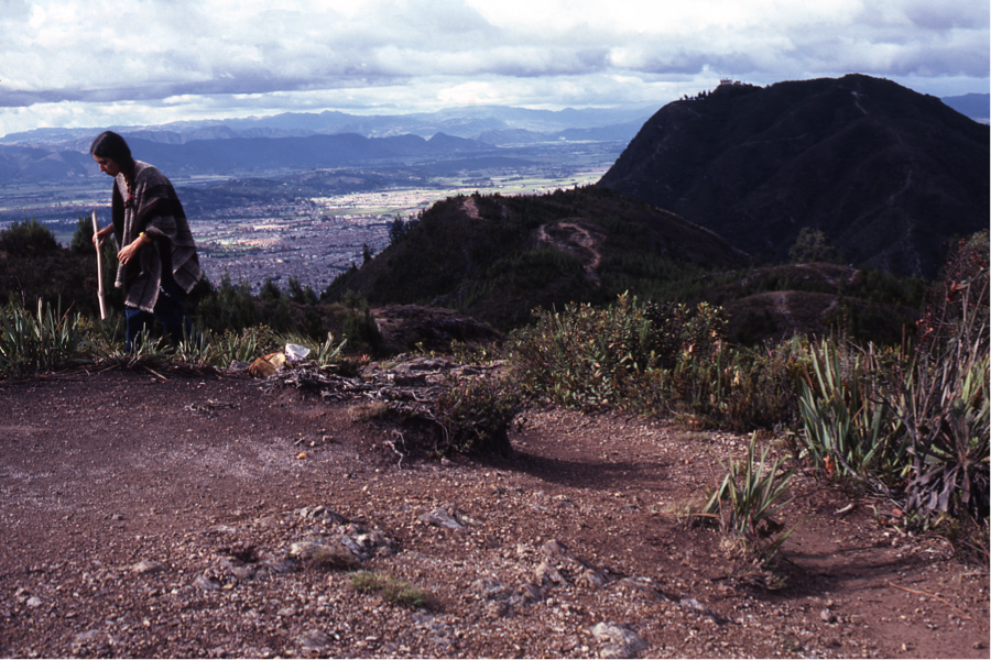 En 1981, al volver a Colombia para empacar sus pertenencias y migrar a Nueva York, su amigo Óscar Monsalve la fotografió en las laderas de los cerros de Bogotá caminando agazapada con una ruana y un bastón. Había reparado en la profundidad del pasto aplanado durante sus propias caminatas por los cerros, confirmando luego con antropólogos que se trataba de las antiguas rutas de los Chibchas y otros pueblos precolombinos. Recreándolas performativamente a través de tejidos con hilos y pequeños portales de hebras amarillas y rojas, Vicuña tejió el paisaje, generando una conexión textil, textual, topográfica y sensual con quienes habían marcado con sus cuerpos esos caminos.