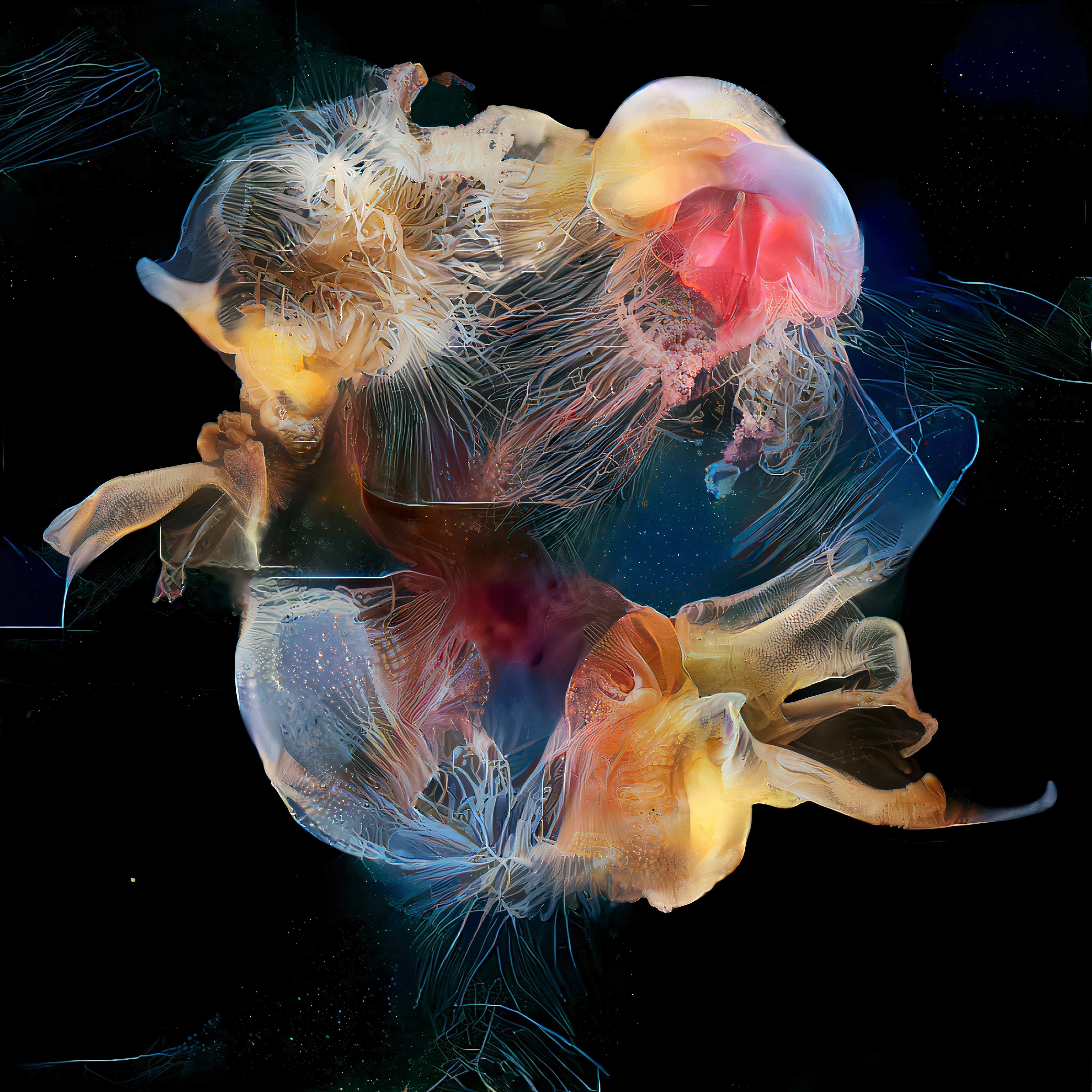 Como ejemplo quisiera mencionar una experiencia infantil que formó mi relación con las medusas. Una vez, mis padres me llevaron a ver una presentación cinematográfica en 3D, uno de esos eventos para los que tenías que ponerte gafas con lentes azules y rojos. La imagen de una medusa que nadaba hacia mí desde la pantalla me produjo un susto terrible. Gracias a ese susto temprano terminé por sentir primero fobia hacia las medusas y en su momento, más adelante, cierta fascinación con sus texturas, colores y formas. Con el tiempo aquella conciencia empavorecida se convirtió en una fuente de inspiración creativa y lo acuático es ahora para mí un sujeto de interés artístico que se ha desarrollado hasta consolidarse en una práctica.