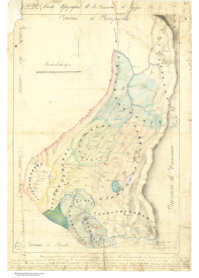 En la década de 1820 el vicepresidente de la República de Colombia, Francisco de Paula Santander, solicitó a los gobernadores hacer llegar a la Secretaría del Interior un mapa de su provincia en donde se indicaran “los ríos navegables que tengan, el punto hasta donde lo son, las principales cordilleras y sus direcciones, los puertos, poblaciones, etc.”10 Según Lucía Duque, se remitieron un total de 20 mapas que representaron alguna porción del territorio neogranadino, principalmente cantones, ciudades y partes de provincias; solo uno de ellos, el del Socorro, delineó una provincia completa11. Llama la atención que no se remitiera ningún mapa del territorio venezolano o ecuatoriano, pues para el momento de esta solicitud, la República de Colombia incluía sus territorios.