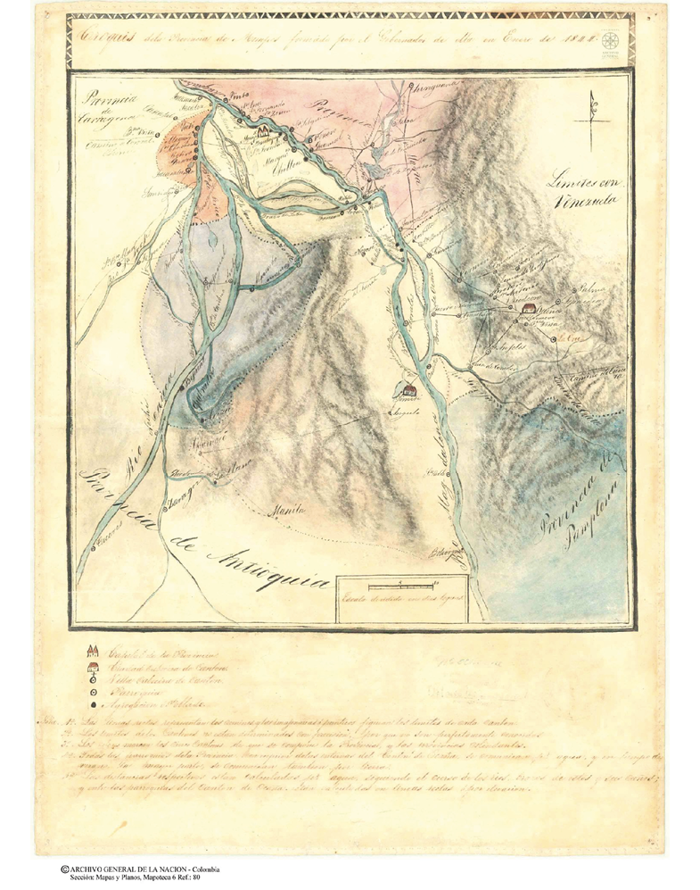 Para formar esta geografía administrativa era fundamental el trazado de los cantones como insistió Ospina, pero no en todos los mapas remitidos se incluyeron. A pesar de ser estructuras territoriales y administrativas vitales en la organización provincial, no se conocían su extensión ni límites, ni por parte del gobierno nacional, ni por las autoridades locales. El mapa de Mompós usó el color para identificar dos espacios internos que parecen coincidir con los cantones de Magangué y Majagual, aunque ellos no son señalados expresamente. El gobernador de la provincia indicaba que los límites de estos “no están determinados con precisión, porque no son perfectamente conocidos”58, lo que explicaría que solo aparecieran representados dos de los cinco que integraban la provincia. En el mapa de Antioquia aparecen las denominaciones —casi superpuestas— de los cantones de Medellín, Rionegro y Marinilla, pero no su trazado, lo que dificulta determinar su delimitación y extensión.