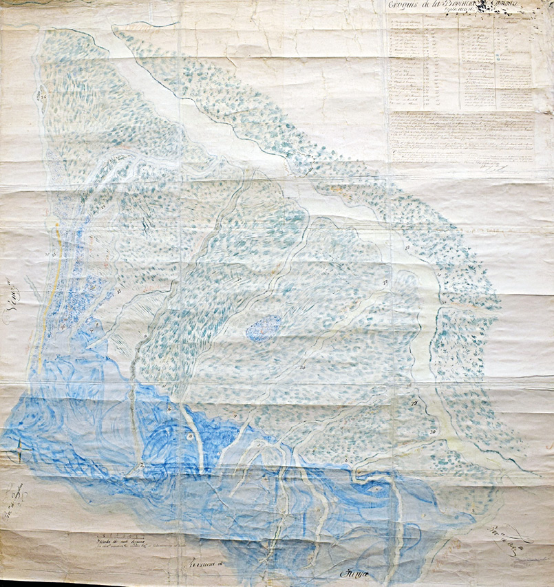 La calidad de los mapas remitidos es desigual. Mientras los de las provincias de Antioquia y Socorro destacan por su sencillez, la utilización de una sola tinta y la limitada representación del relieve (imágenes 2 y 3), los de las provincias de Tunja y Mompós sobresalen por el uso del color para marcar la división administrativa y el curso de los ríos (imágenes 4 y 5). En el de Casanare el color es usado para representar las características geográficas de la provincia, pero no su división cantonal, cuya ausencia se podría explicar por el desconocimiento del autor sobre sus límites o la dificultad para precisarlos con claridad (ver imagen 6)27.