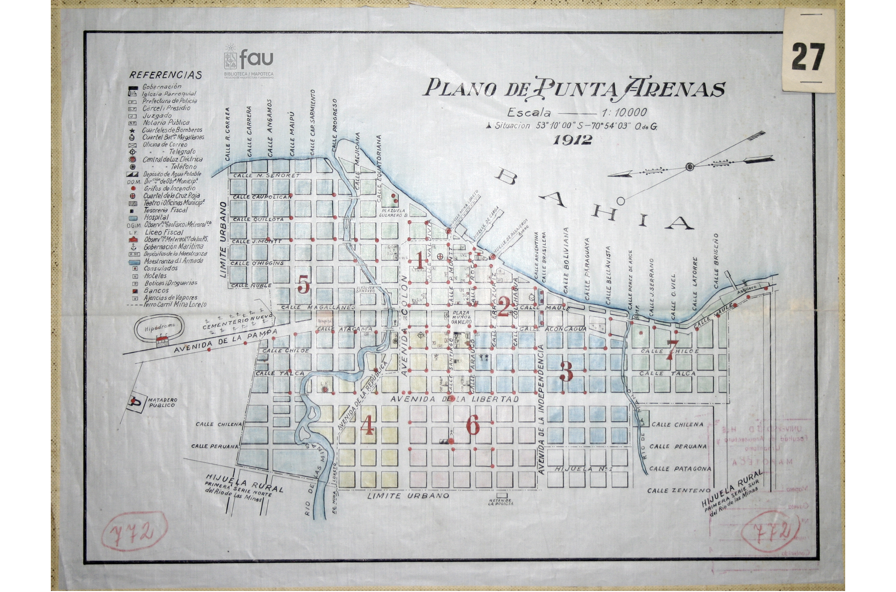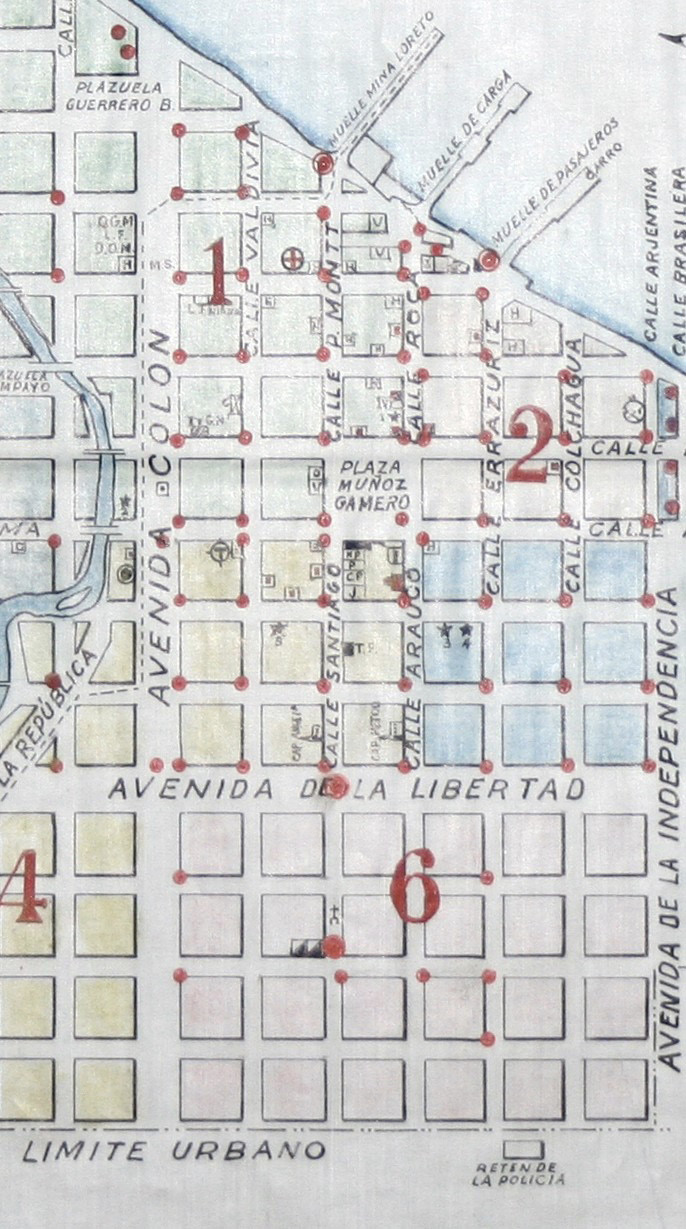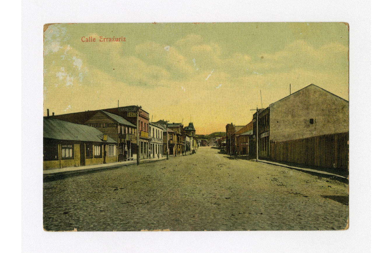 Nota. En la vereda inferior de la plaza Muñoz Gamero se ubican la catedral y la Gobernación. A su costado, por la calle Santiago, el cuartel de policía, el juzgado y la cárcel. Hacia la plaza miran las mansiones de los principales hacendados y banqueros. En la cuadra siguiente, hacia el sur (a la derecha), la calle Errázuriz: en esa tercera cuadra desde el muelle se encontraban las casas de “Demónigo” y Gordinsky en la ciudad. En 1909 la Junta de Alcaldes amplió y alejó del centro el perímetro de las casas de tolerancia a las calles Colchagua y Errázuriz entre Libertad y Peruana, la tercera calle antes del límite urbano. En 1927 Arauco se convirtió en Fagnano, Peruana en Arauco, Aconcagua en Nogueira y la Avenida de la Libertad en España.