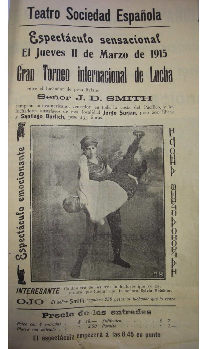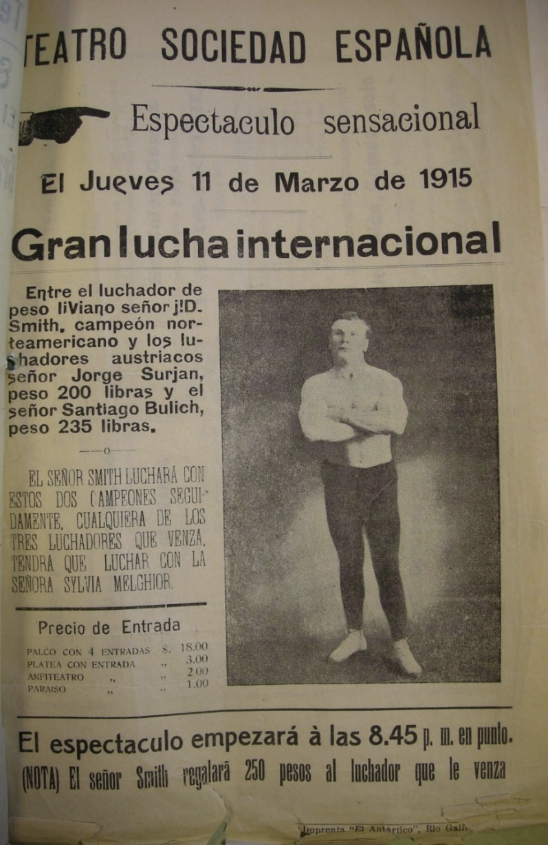 Mucho tiempo después de revisar el Fondo Judicial de Punta Arenas se presentó una oportunidad de visitar el Archivo Histórico Municipal de Río Gallegos, capital de la actual provincia argentina de Santa Cruz. Melchior y Smith reaparecen allí, en un documento, a unos 250 kilómetros de Punta Arenas. Gallegos era el enclave argentino más austral del continente. Su población había pasado de 150 personas en 1895 a más de 1500 en 1912, como resultado de la avasalladora expansión de la ganadería ovina: los hombres duplicaban a las mujeres y los extranjeros a los argentinos; como en Natales, la principal fuente de empleo era un frigorífico59. Allí, la Municipalidad de Río Gallegos abrió un expediente a solicitud de J. D. Smith: “solicita[ba] permiso para efectuar dos funciones de lucha romana en el Salón de la Sociedad Española los días 11 y 14 del corriente mes de marzo 1915”60. Esto sucede pocos días despues de efectuarse la acción judicial en Magallanes contra el rumano Gordinsky. En la carpeta conservada en el Archivo Histórico Municipal se lee que el servicio fue autorizado y se encuentran dos carteles impresos que publicitan el evento (imágenes 5 y 6).