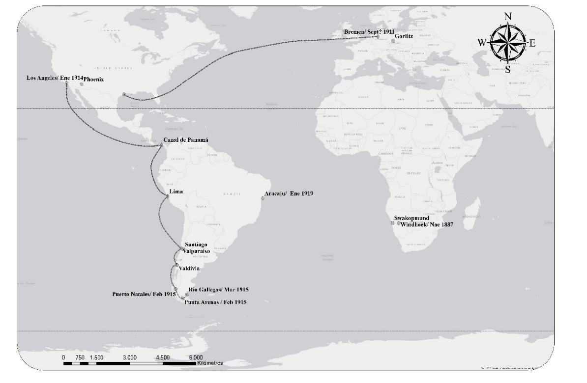 Como señalara Lara Putnam, la búsqueda digital de información es un instrumento clave para la historia transnacional, que facilita y oscurece la historización por varios motivos: por un lado, “el aprendizaje sobre lugares específicos que requería la investigación histórica en un mundo predigital ya no forma parte del proceso”, al tiempo que las fuentes digitalizadas favorecen la sobrerrepresentación de los flujos noratlánticos58. En este caso, sin embargo, la información relevada en archivos locales sudamericanos (entendiendo aquí por tales el municipal de Río Gallegos, cabecera del argentino Territorio de Santa Cruz, e incluso los nacional-metropolitanos, como el Fondo Judicial de Punta Arenas concentrado en el Archivo Histórico Nacional chileno, en Santiago) junto con el acceso a una digitalización discriminatoria permite fortalecer conexiones suratlánticas de las que ignoramos sus contextos en el norte (¿por qué la alemana Sylvia Melchior debe emplearse en la prostitución en la colonial Swakopmund y cómo es que llega a casarse con un luchador californiano?). En este caso, es la inmersión en el archivo de papel sudamericano la que permite arrojar luces sobre trayectorias de sujetos procedentes de un imperio en crisis y otro en auge.