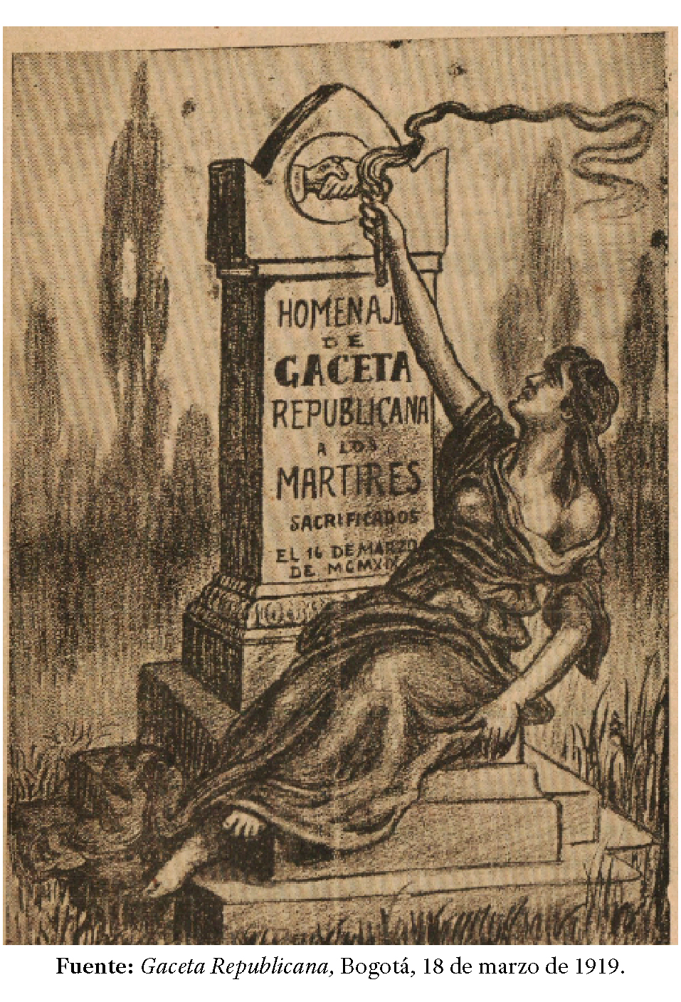 El enlace de Romero con la actividad socialista se dio, sin embargo, en el periódico de tendencias republicanas Gaceta Republicana, que se agrupaba alrededor de los principios políticos del expresidente Carlos E. Restrepo. Gaceta, fundado por Enrique Olaya Herrera, fue una experiencia decisiva para el dirigente socialista en ciernes. Bajo la redacción de Carlos O. Bello, el periódico abrió sus páginas al seguimiento de la actividad sindical y los primeros manifiestos del socialismo que se congregaron en 1919 bajo la acción del Partido Socialista22. Las jornadas del 16 de marzo, en las cuales los artesanos de Bogotá salieron a las calles a rechazar la compra de uniformes importados por parte del gobierno conservador de Marco Fidel Suarez, definieron un nuevo momento para la vida pública de Romero. La movilización que fue reprimida, con un saldo de diez muertos y quince heridos, marcó a los redactores y colaboradores del periódico, quienes convirtieron las páginas de Gaceta Republicana en un escenario de denuncias por la masacre de artesanos y el rechazo al gobierno (imagen 1). Las denuncias formuladas por Romero, Eduardo Carvajal, Marco Tulio Amorocho y Manuel Grisales les costó el encarcelamiento a este grupo de redactores.