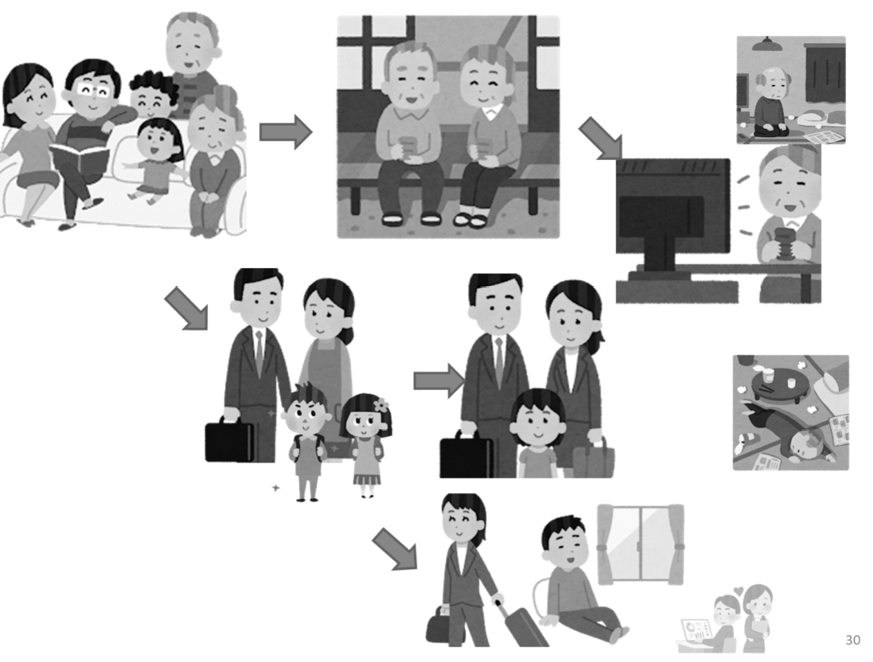 Cambios en la estructura familiar en Japón. Creado por el autor utilizando el material gratuito de "Tienda de Ilustraciones".