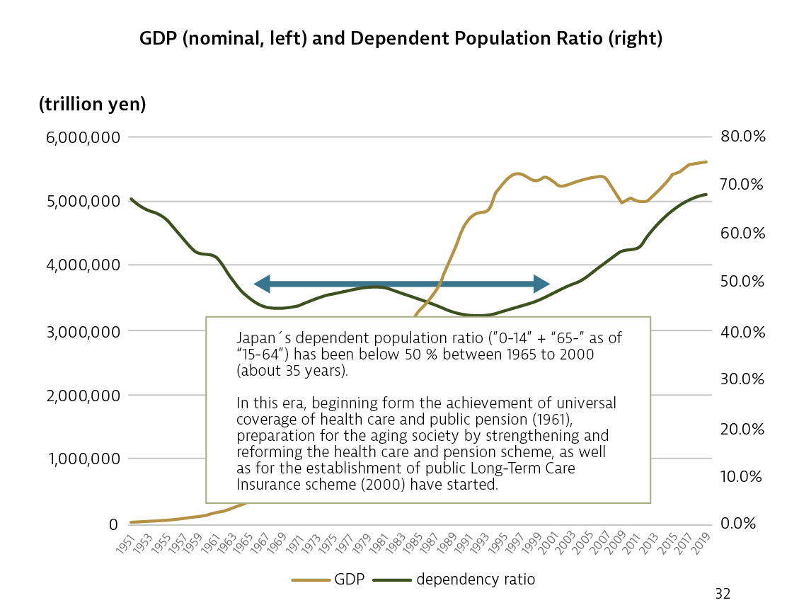 Este periodo en Japón comenzó con la consecución del seguro de salud y las pensiones universales en 1961, y a partir de la década de 1980, estos sistemas experimentaron importantes reformas anticipándose al envejecimiento de la población. En 1989 se introdujo un impuesto al consumo, una importante fuente de financiación de la seguridad social en una sociedad en proceso de envejecimiento, y en el año 2000 se estableció un sistema público de seguro de cuidados de enfermería. El crecimiento económico se estancó desde mediados de la década de 1990, cuando progresaba el debate sobre la creación del seguro de cuidados de enfermería, el envejecimiento de la población se aceleró y se predijo un aumento de la tasa de dependencia. En este contexto, el hecho de que durante el siglo XX se establecieran nuevos impuestos y sistemas de seguro social que impusieron nuevas cargas a la población, con el apoyo de la opinión pública, es algo que “se consiguió justo a tiempo”3.