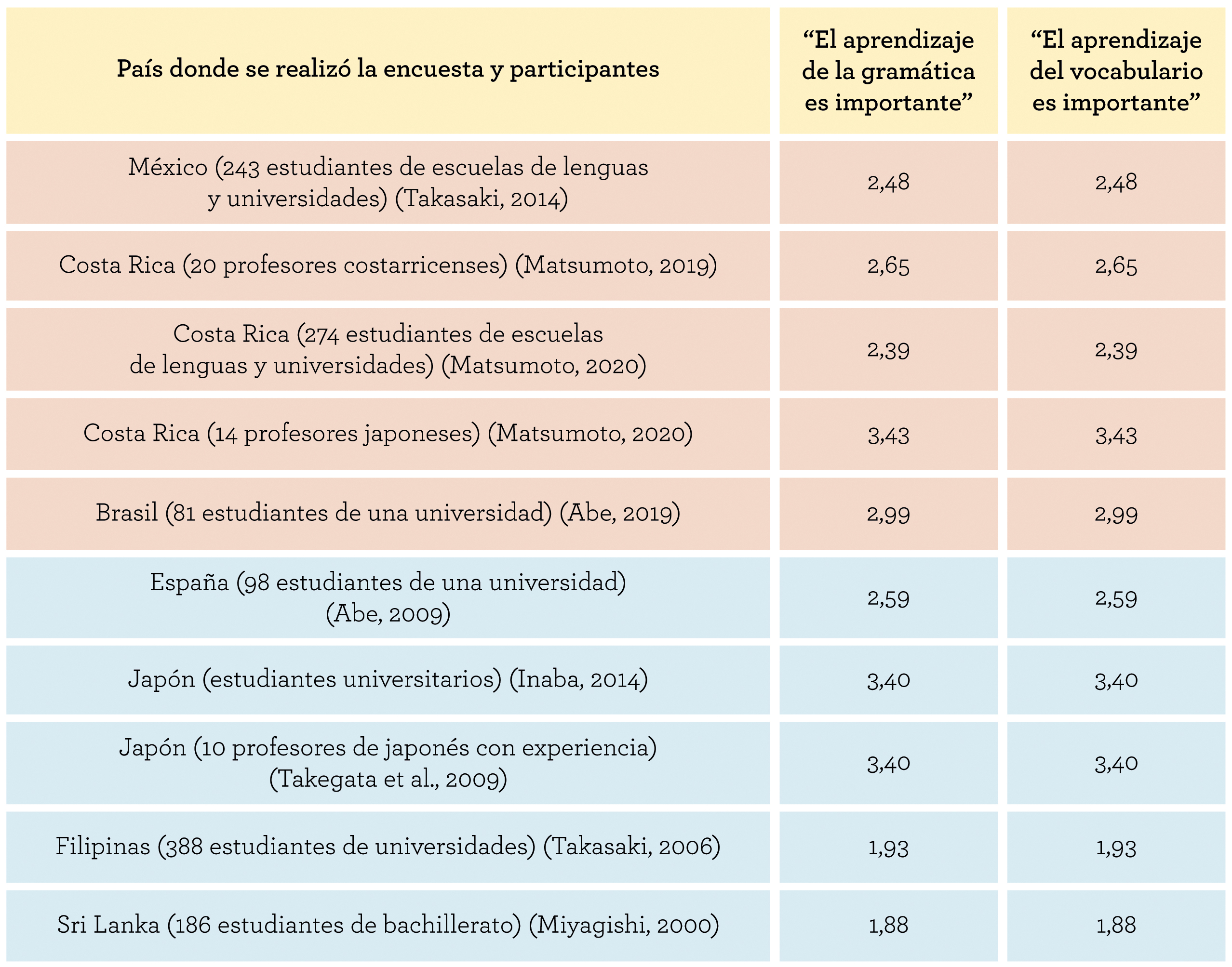 Se ha investigado mucho en México (Takasaki, 2014), Costa Rica (Matsumoto, 2019, 2020) y Brasil (Abe, 2019). En esos casos, al igual que los estudiantes de España, los de estos países no están tan de acuerdo con la idea de que tanto la gramática como el vocabulario son importantes. En la parte inferior de la tabla, los estudiantes de países del sur y sureste de Asia, como Filipinas (Takasaki, 2006) y Sri Lanka (Miyagishi, 2000), están muy de acuerdo con la idea de que tanto la gramática como el vocabulario son importantes mientras que los estudiantes universitarios japoneses (Inaba, 2014), profesores de japonés en Japón (Takegata et al., 2009) y profesores de japonés en Costa Rica (Matsumoto, 2020), marcados con una estrella (*) en la tabla, están algo en desacuerdo con la idea de que el aprendizaje de la gramática es importante y también tendían a estar en desacuerdo con la idea de que el aprendizaje del vocabulario es importante. No sabemos exactamente la razón para esto, pero estos resultados apuntan a una diversidad de puntos de vista y creencias de parte de diversos grupos de personas frente al aprendizaje de otra lengua.