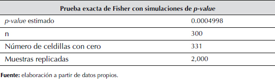 Para comprobar o descartar esta hipótesis es posible utilizar la prueba exacta de Fisher62. Esta prueba estadística no paramétrica o de libre distribución mide la probabilidad de obtener la distribución de frecuencias observada en la muestra recolectada63. Esta prueba es idónea para muestras pequeñas y con frecuencias esperadas menores a 564. Los datos utilizados en esta investigación cumplen con estos requerimientos estadísticos, ya que la muestra recolectada obtuvo información de 43 pizzerías distribuidas en 300 ofertas posibles, además de que existen pizzerías cuya frecuencia esperada de aparición es de 0 veces. A diferencia de la prueba Ji cuadrada de Pearson que asume una distribución normal, esta prueba estadística funciona en datos con libre distribución y casos de frecuencias esperadas de 065.