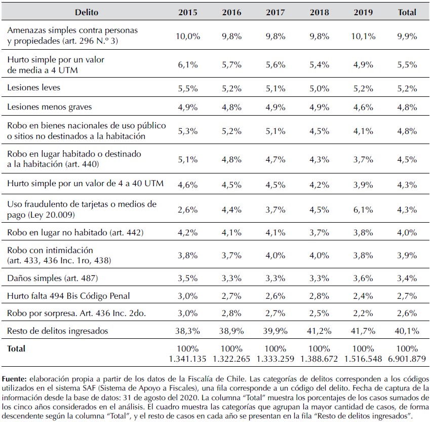 En el cuadro 2 se repite la tendencia observada respecto a las cifras que registran las policías: si bien los delitos ingresados cuantitativamente más relevantes forman parte de los DMCS —excepto por las amenazas, las que constituyen alrededor del 10% de todos los casos—, estos delitos no necesariamente responden a aquellos que más afectan la seguridad ciudadana tal y como la conciben las organizaciones encargadas de administrarla. Ciertamente, amenazar al cónyuge, golpear al vecino o robarse algo del supermercado no es algo afortunado —y es delito—, pero no es lo mismo que intimidar con una pistola al conductor de un auto para robárselo o forzar la puerta de una casa para robar lo que haya adentro. Estas últimas situaciones son mucho más cercanas a la definición de la inseguridad ciudadana que movilizan las interpretaciones de cifras que, sin embargo, dan cuenta en gran medida de situaciones más parecidas a la amenaza al cónyuge, las lesiones al vecino o el robo en el supermercado. No se trata, entonces, de minimizar la relevancia de estos hechos, sino de resituarlos en sus contextos de producción.