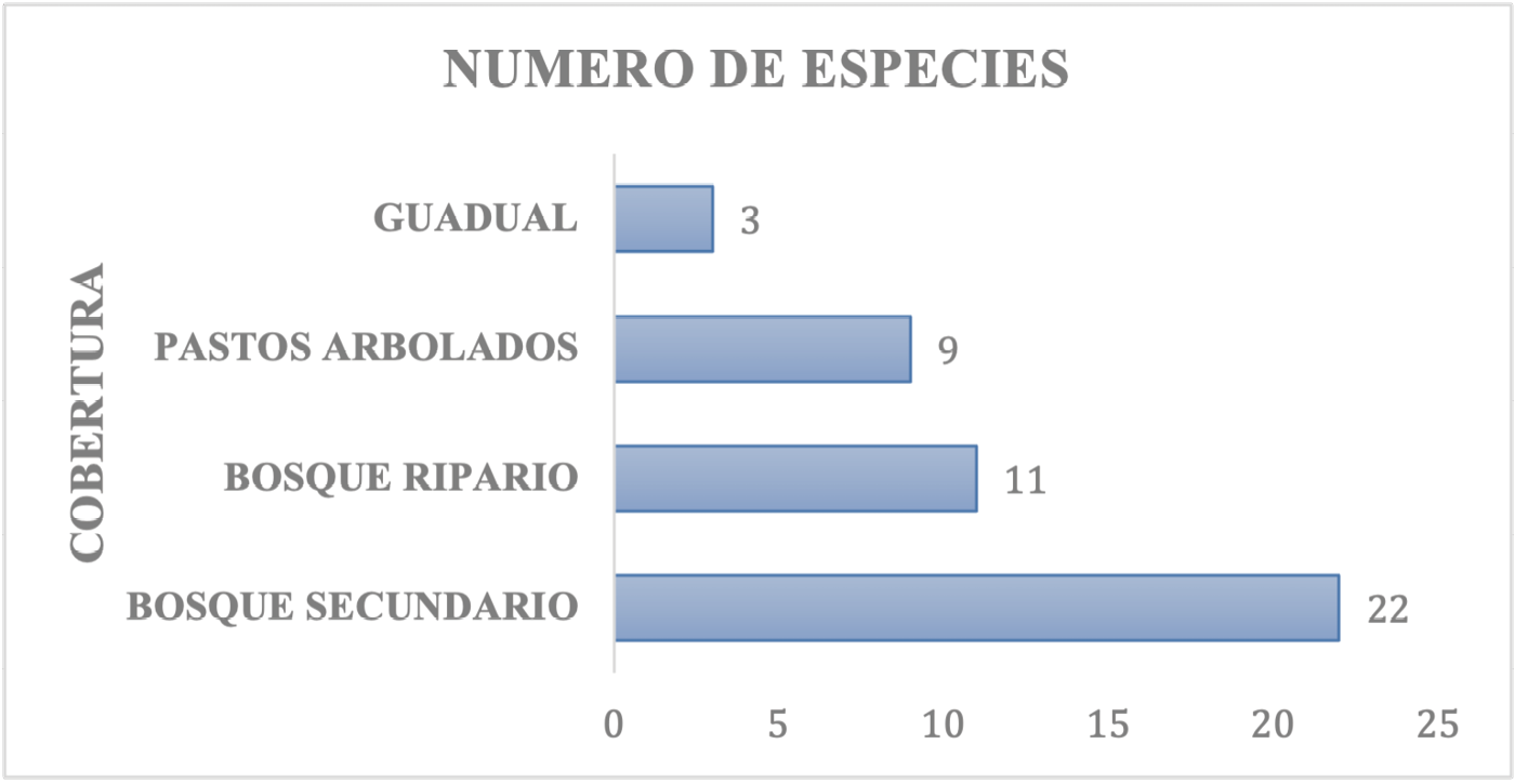 En total se encontraron 184 individuos de la familia Orchidaceae, pertenecientes a 20 géneros y a 36 especies entre los 1 800 y los 1 866 m s. n. m., en las cuatro coberturas presentes a lo largo de aproximadamente el 80 % del área total de los predios Cajones y Quimbaya. Los hallazgos variaron según la cobertura vegetal: el bosque secundario y el bosque ripario mostraron la mayor abundancia y diversidad de orquídeas, mientras que el guadual presentó el menor número de especies (gráfico 1).