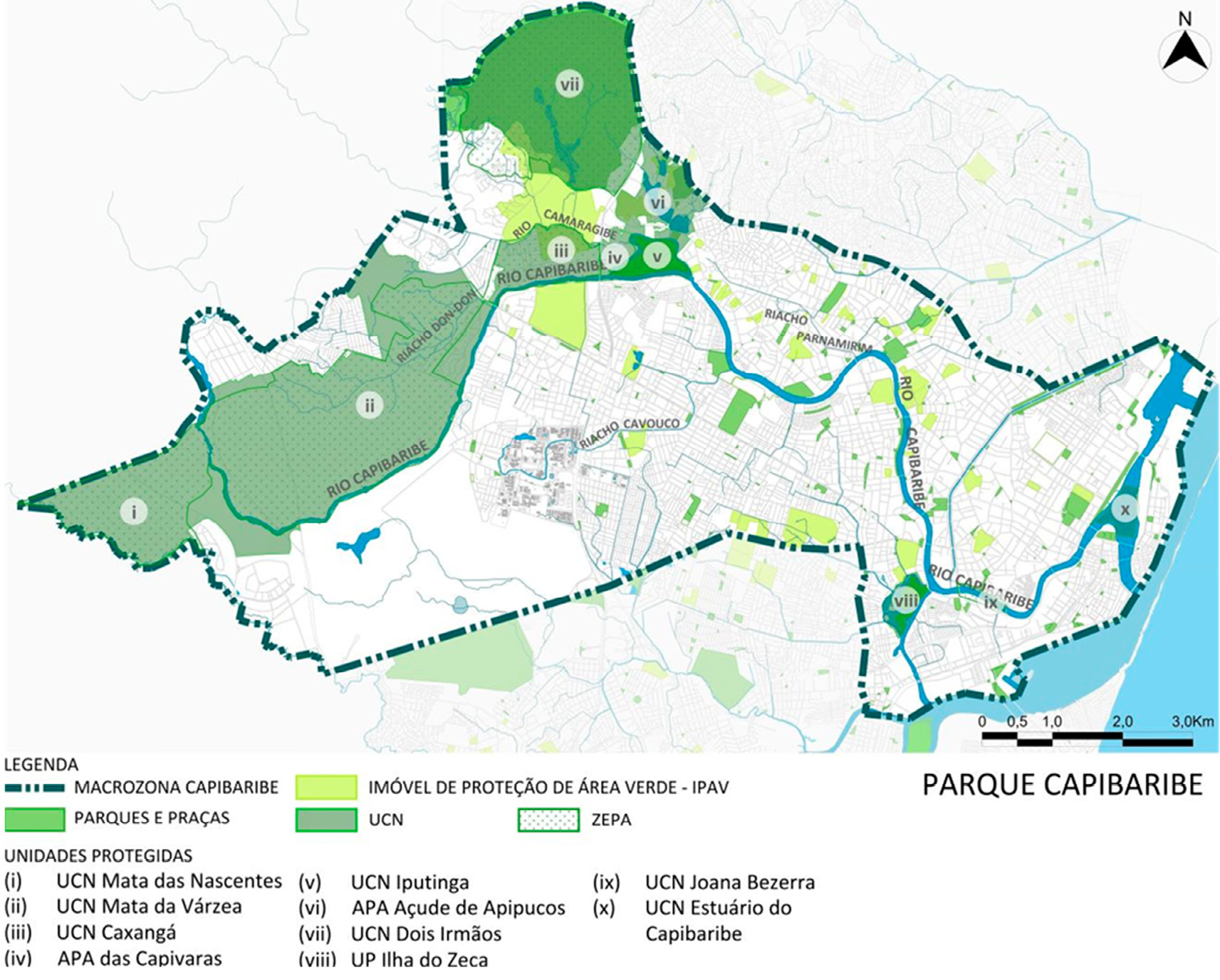Figura 3. Unidades de Conservação da Natureza na Macrozona Rio Capibaribe. Estruturação realizada com base no Pura-Capibaribe (UFPE/INCITI, 2020), no Plano Diretor (2008) e no SMUP (2014) sobre base das Informações Geográficas do Recife (ESIG), 2020. Fonte: Silva et al. (2021 p. 284).