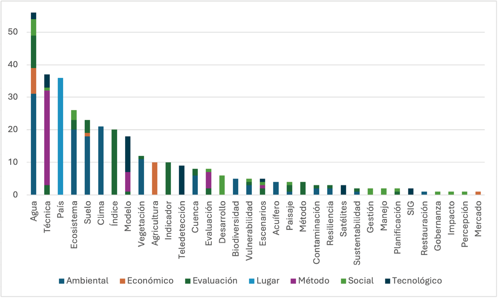 Las áreas disciplinares se relacionan con las ciencias exactas e ingeniería, y se muestra que la mayor producción fue por parte de ciencias ambientales, seguida de recursos hídricos y geociencia. Esto se puede relacionar con el tipo de variables utilizadas para la evaluación, así como las palabras clave determinadas en los artículos, en donde las palabras “agua” y “análisis” son las más frecuentes. A partir de la categorización de las palabras en los grupos ambiental, social, económico, tecnológico, evaluación, método y lugar, es posible una comprensión más estructurada de los temas abordados en los artículos científicos. La categoría ambiental predomina, con temáticas relacionadas a clima, agua y ecosistema, seguida de las categorías de “evaluación” y “lugar”.