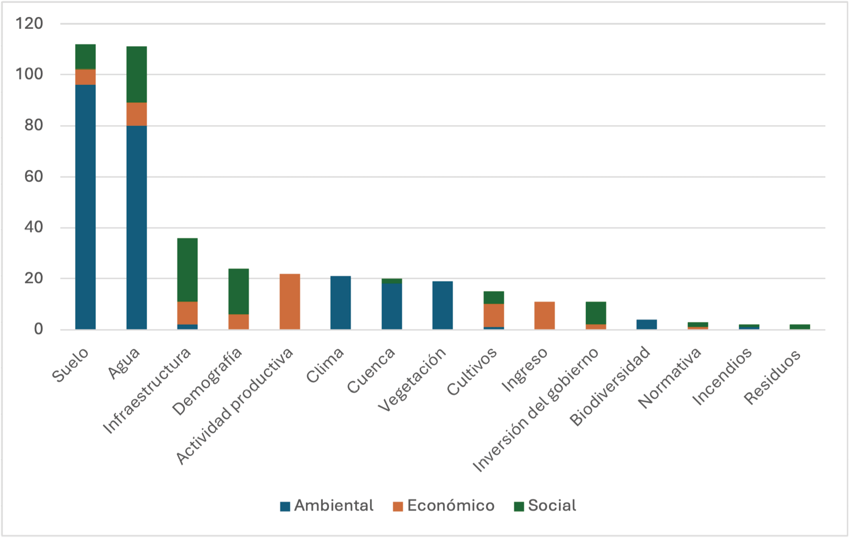 Además, las variables utilizadas en los artículos científicos se categorizaron y clasificaron por tipo: económico, social y ambiental. Posteriormente, se agruparon en 15 categorías como clima, agua, suelo, vegetación, datos demográficos e ingreso, entre otras; y 36 subcategorías que se relacionaron con el recurso, como calidad y cantidad de agua y calidad del suelo, entre otras.