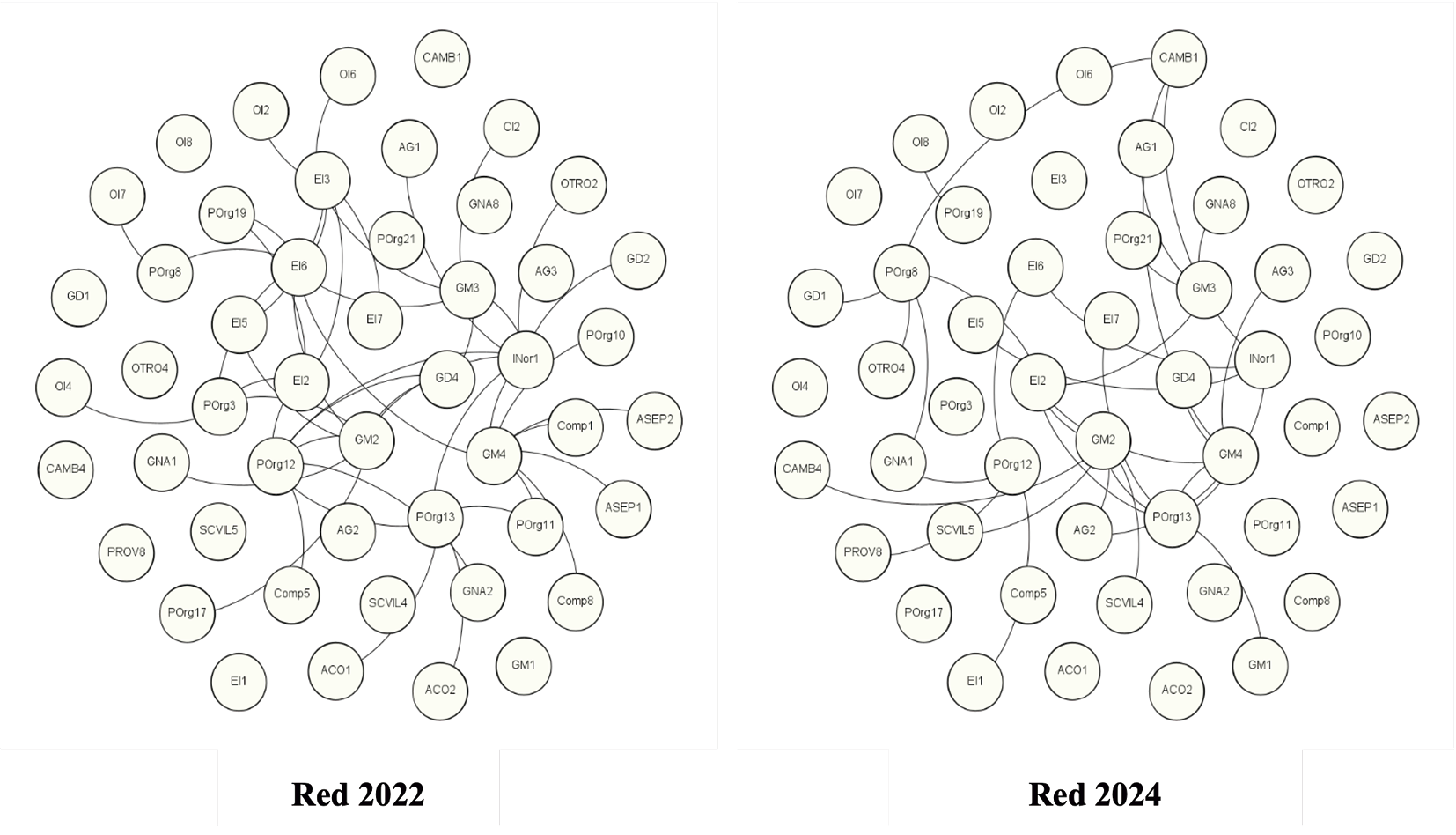 Tabla 3. Resultado de los indicadores en el análisis de redes sociales en 2022 y 2024. Fuente: elaboración propia con base en los resultados obtenidos en el análisis de redes sociales mediante el uso de UCINET®, NetDraw® y Gephi®.