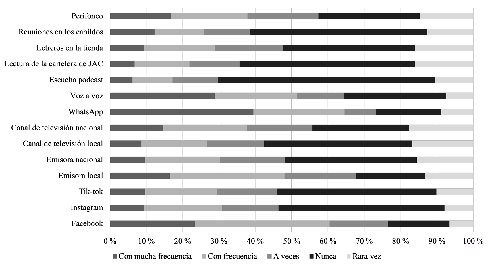 Las personas encuestadas utilizan con mayor frecuencia herramientas como WhatsApp, voz a voz y Facebook para mantenerse informados de las noticias locales. Los medios menos utilizados son los podcast, reuniones en los cabildos, lecturas en cartelera de juntas de acción comunal (JAC), Instagram y Tik-Tok (figura 3).