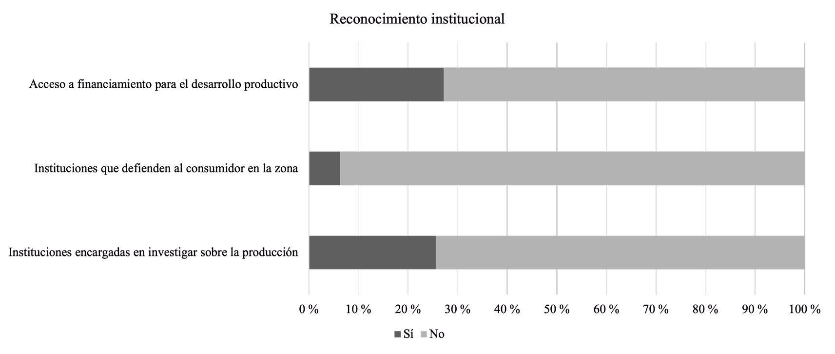 Por otro lado, no se presenta reconocimiento institucional en términos de: defensa del consumidor (94 %), investigación sobre la producción (74 %) y opciones de financiamiento (73 %) (figura 5).