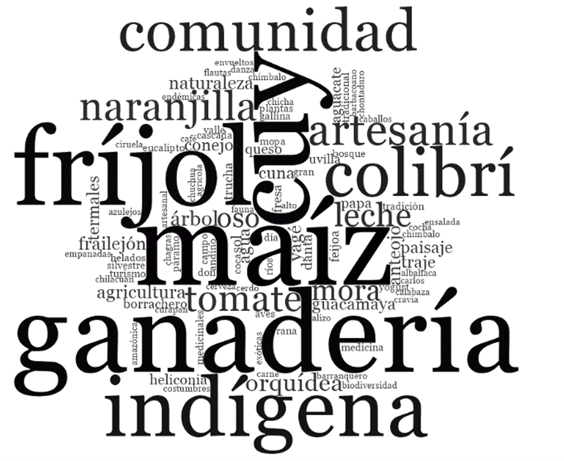 Además, se referencia al Alto Putumayo como un lugar biodiverso donde se presenta producción agrícola principalmente de maíz (Zea mays), fríjol (Phaseolus vulgaris), naranjilla (Solanum quitoense Lam.), tomate (Solanum lycopersicum) y mora (Rubus ulmifolius); la producción pecuaria como la ganadería bovina y la cuyicultura; y el indudable reconocimiento de la cultura indígena en la zona, al rescatar elementos como las artesanías y la medicina ancestral. También cobra relevancia las aves como los colibrís y el guacamayo (figura 6).