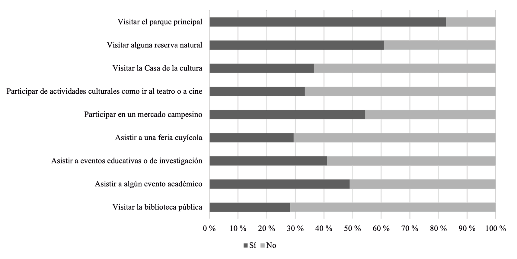 Además, las personas manifestaron participar principalmente de las actividades desarrolladas en los parques principales, visita de reservas naturales y mercados campesinos. Dentro de las actividades con menos participación se consideran las visitas a la biblioteca pública, asistir a ferias particulares sobre cuyes y productos lácteos; y participar en actividades culturales como ir a teatro o a cine (figura 4).