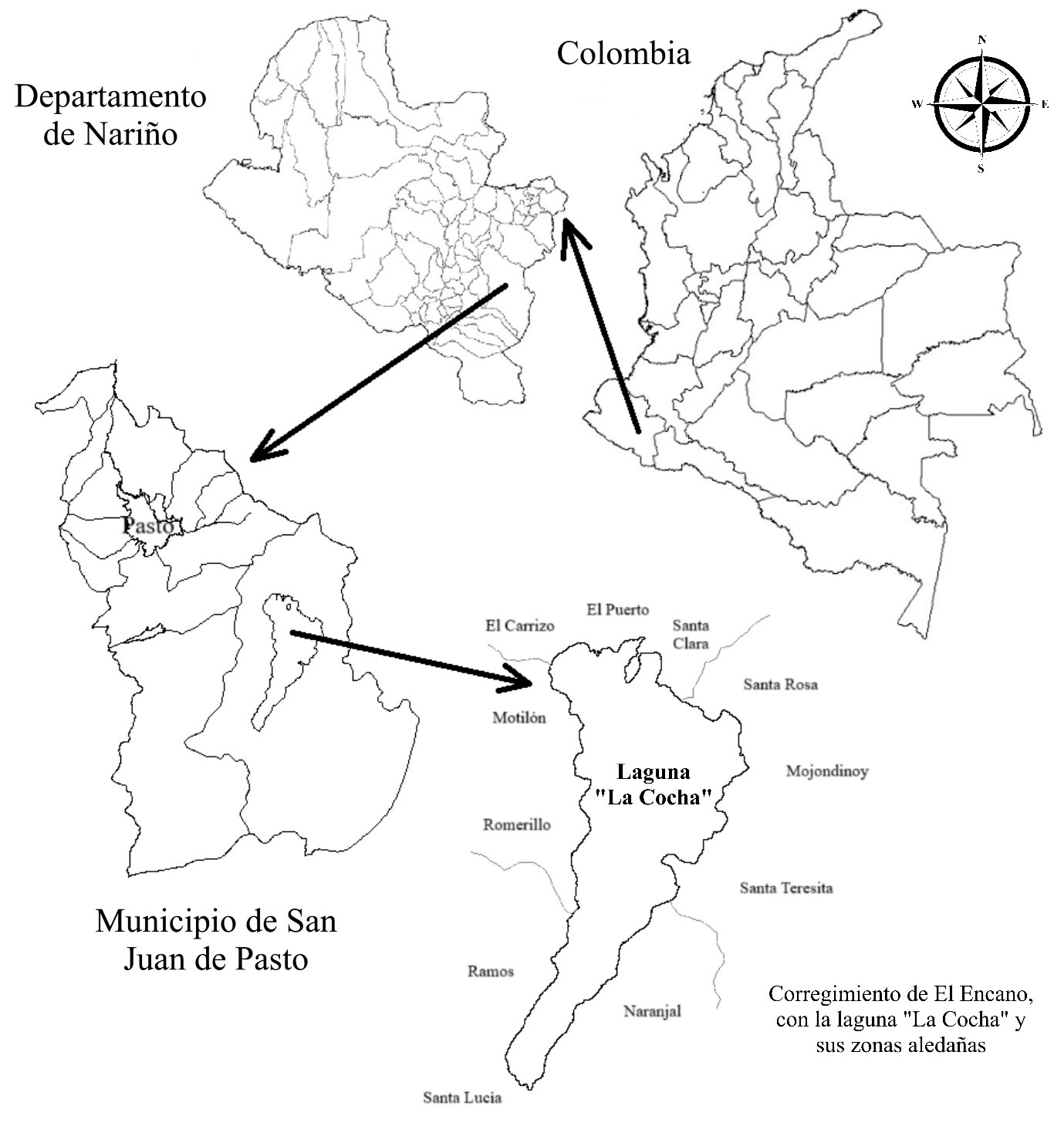 Figure 1. Maps showing the location of the study area: Lake La Cocha, Nariño, Colombia.1Source: Own elaboration.