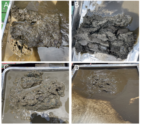 The MOM-B investigation evaluates three groups of parameters: 1) biological parameters, 2) chemical parameters (pH and redox potential), and 3) sensory parameters (Hansen et al., 2001) (Table 2). Multiple modalities were assessed for each group of parameters, and a score was assigned accordingly (Table 2). The higher the impact observed on the sediments, the higher the score given. Measurements were performed sequentially, starting with Group II parameters, followed by Group III, and ending with Group I parameters, as detailed below.