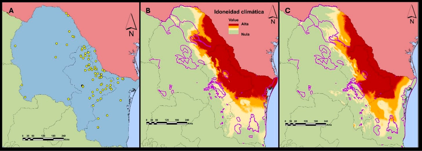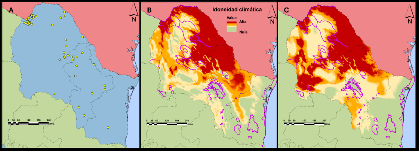 Resumo. As Áreas Naturais Protegidas (ANPs) são pilares fundamentais para a conservação da biodiversidade, mas são vulneráveis a múltiplas pressões e, em particular, a invasões biológicas devido às atividades humanas constantes e intensas. A região nordeste do México, que inclui Coahuila, Nuevo León e Tamaulipas, apresenta alta biodiversidade e elevado endemismo, com mais de 80 ANPs. No entanto, nos últimos anos, registrou-se a presença de espécies exóticas invasoras (EEI) com alto potencial de disseminação nessa região. Neste artigo, apresenta-se uma análise das invasões biológicas por meio da avaliação da idoneidade climática atual e futura de três EEI: o pombo-de-colar-turco (Streptopelia decaocto), o porco-asselvajado (Sus scrofa) e o carneiro-da-barbária (Ammotragus lervia) em ANPs do nordeste do México, com o objetivo de identificar áreas de alto risco de invasão e contribuir para o desenho de estratégias preventivas de manejo e conservação. A partir da modelagem do nicho ecológico dessas espécies pelo programa MaxEnt, obtiveram-se as áreas potenciais de distribuição geográfica para essas espécies e delimitaram-se as zonas de maior risco nas ANPs. Identificou-se que a distribuição potencial das três espécies abrange aproximadamente 44% da superfície dessas zonas de conservação; as áreas de maior vulnerabilidade correspondem a Maderas del Carmen, Ocampo e Cumbres de Monterrey. Os modelos obtidos indicam um aumento na distribuição sob o cenário climático futuro para A. lervia e S. scrofa domesticus, enquanto a distribuição de S. decaocto apresenta uma leve diminuição. Este estudo sugere a implementação de uma estratégia regional de monitoramento e vigilância de espécies exóticas invasoras para empreender ações de manejo que interrompam a dispersão dessas espécies e mitiguem seu impacto sobre a flora e a fauna silvestres no nordeste do México.