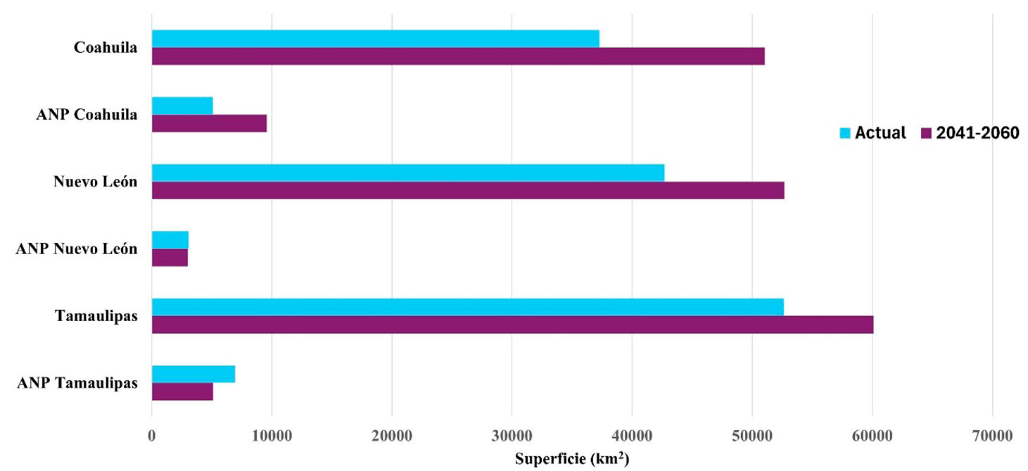 Abstract. Protected Natural Areas (PNAs) are essential for biodiversity conservation, but they face multiple threats, particularly biological invasions driven by ongoing, intense human activities. The northeastern region of Mexico, covering Coahuila, Nuevo León, and Tamaulipas, has high biodiversity and endemism, with more than 80 PNAs. However, this region has recently recorded the presence of invasive exotic species (IES) with strong potential for spread. This paper analyzes biological invasions by assessing the current and future climatic suitability of three invasive exotic species: collared dove (Streptopelia decaocto), feral pig (Sus scrofa), and Barbary sheep (Ammotragus lervia) in PNAs of northeastern Mexico. The goal is to identify high-risk invasion areas and to inform the design of preventive management and conservation strategies. Using the MaxEnt program to model the ecological niche of these species, potential geographic distribution areas were identified, and the highest-risk zones within the PNAs were outlined. The potential distribution of the three species was estimated to cover approximately 44% of the area of these conservation zones; the most vulnerable areas are Maderas del Carmen, Ocampo, and Cumbres de Monterrey. The obtained models indicate an increased distribution of A. lervia and S. scrofa domesticus under the future climate scenario, whereas the distribution of S. decaocto shows a slight decrease. This study recommends the regional implementation of a monitoring and surveillance strategy for invasive exotic species to guide management actions that interrupt their dispersal and reduce their impacts on native flora and fauna in northeastern Mexico.
