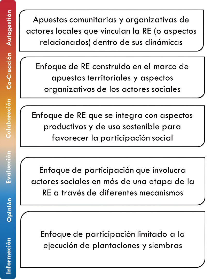 Por último, se destaca el papel que ha tomado algunos aspectos de la RE (como el viverismo, el rescate de plántulas y las siembras de especies nativas en cuencas de arroyos) dentro de las apuestas comunitarias e iniciativas colectivas de las familias y las comunidades rurales. Corresponde a la escala de autogestión, el nivel máximo de participación, donde la toma de decisiones y la acción recae completamente sobre los actores involucrados.
