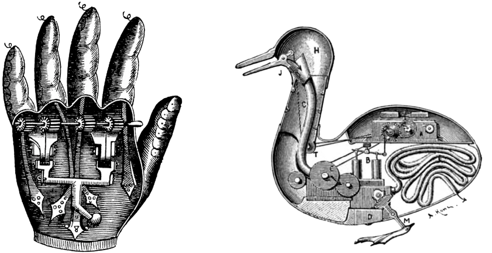 Imagen 2. Científicos como Georges Cuvier comparaban estructuras óseas y musculares con piezas de maquinaria. En el siglo XVIII se popularizaron los autómatas, como el famoso pato mecánico de Jacques de Vaucanson, que imitaban seres vivos y reflejaban la idea de la vida como un proceso mecánico. Fuente: imagen obtenida del dominio público, Wikimedia Commons.