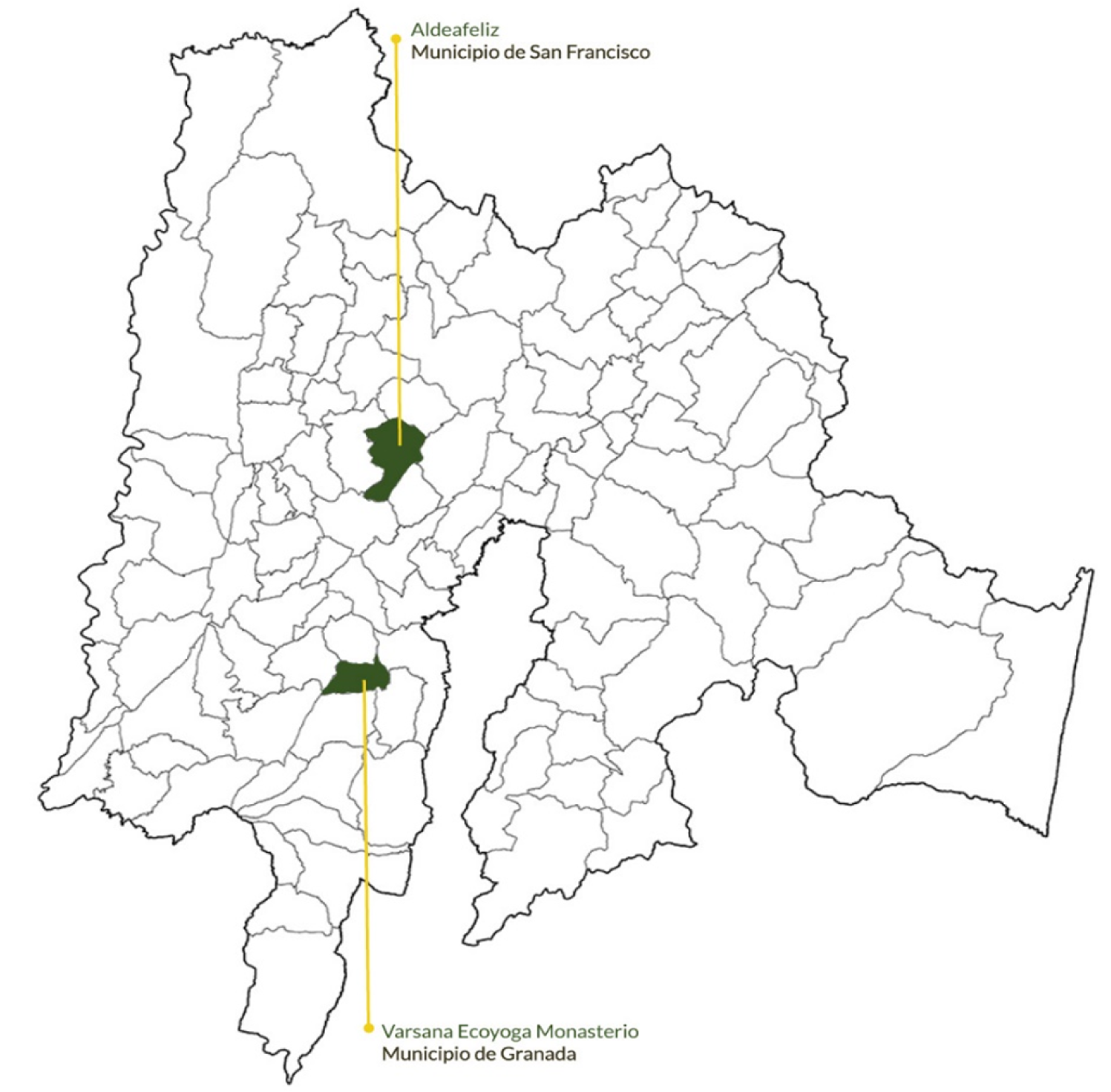 No es el caso de Aldeafeliz y Varsana, las dos ecoaldeas en las que se desarrolló la investigación. La primera hace parte de la GEN, y la segunda, en tanto comunidad religiosa, pertenece a la Misión Vrinda Colombia. Ubicadas en los municipios de Granada y San Francisco (Cundinamarca) desde 1980 y 2006, respectivamente, y a poco más de una hora y media de Bogotá, ambas comunidades han consolidado la circulación y permanencia de personas interesadas en una convivencia mediada por la sostenibilidad —abarcante de lo social, lo económico y lo ambiental— y en una experiencia espiritual y/o religiosa, como sucede en Varsana. Sus habitantes se inscriben en lo que Méndez caracteriza como neorrurales: “migrantes voluntarios de anterior residencia urbana que deciden mudarse al campo, movilizados por bases ideológicas definidas a partir de su inconformidad con lo asumido, por estos mismos actores, como modelo de vida citadino” (2012, p. 115).