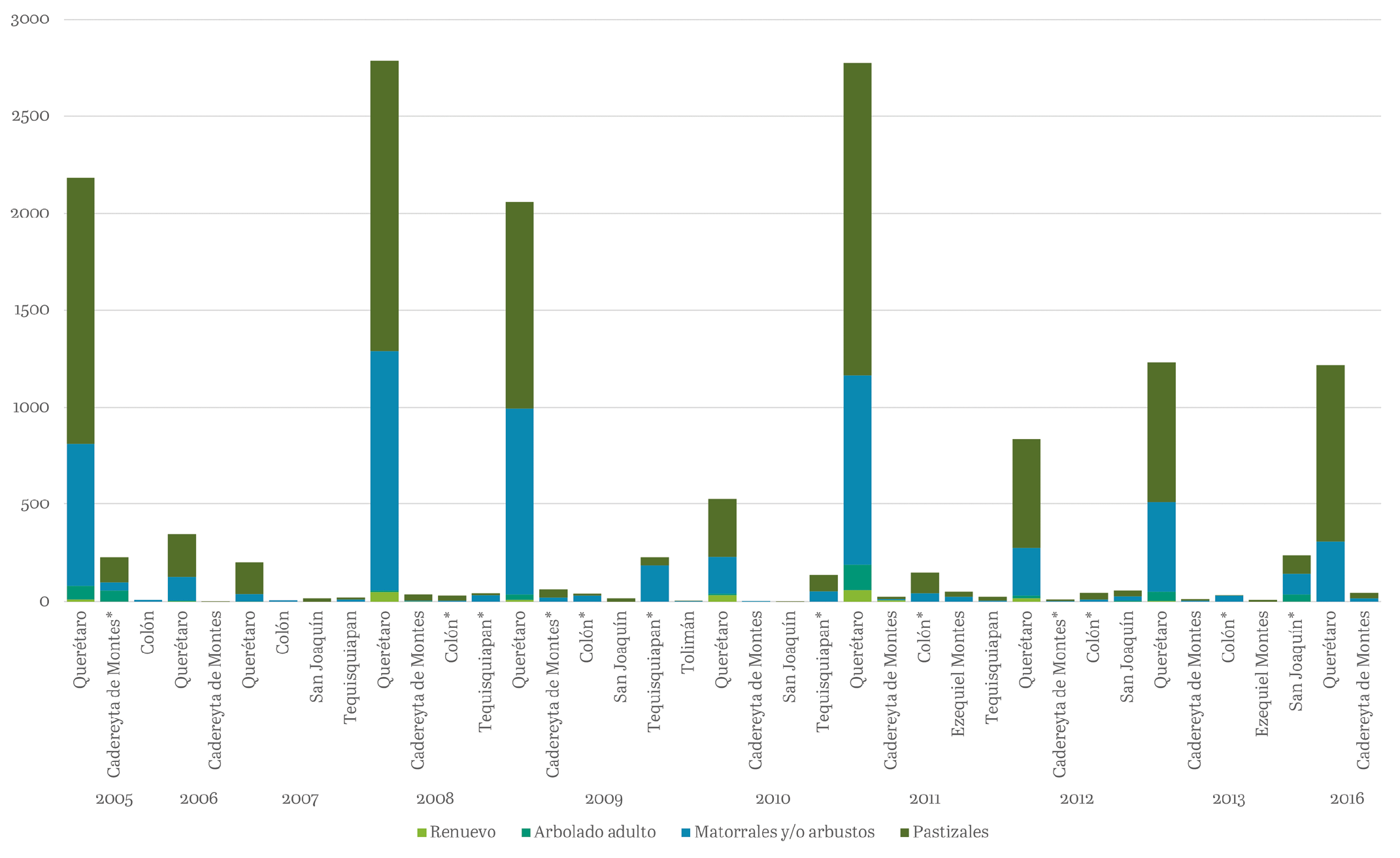 En Querétaro existen datos acerca de los incendios forestales a escala municipal. Los eventos están catalogados por tipo de superficie afectada: arbolado (renuevos o arbolado adulto) y no arbolado (matorrales y/o arbustos, y pastizales). En los años recientes, seis de los siete municipios de la zona semiárida de Querétaro experimentaron incendios que, en su mayoría, se han atribuido a causas humanas. Sin embargo, la proporción que estos eventos suelen representar, dentro de la superficie estatal cuantificada por año, es pequeña, en comparación con el número y la superficie de eventos que ocurren en el municipio de Querétaro, el más poblado de la entidad (figura 6).