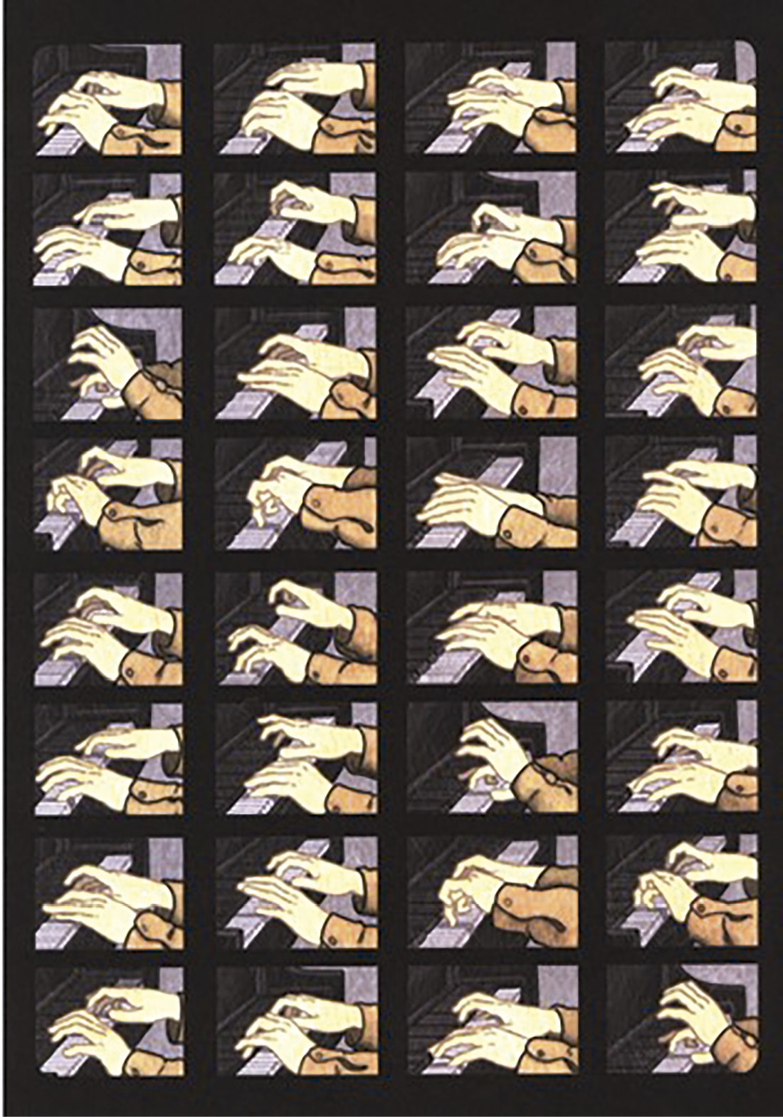 Como se observa en la plancha de la figura 1, la disposición repetitiva de la retícula, lejos de generar redundancia, ofrece a la vista los matices del movimiento de las manos sobre el teclado y, a través de la interpretación de dichas acciones —por intermedio del fenómeno del cerrado—, el lector se abre voluntariamente a “facilitar” la representación de la música en su lectura. La mudez del medio es evidente, pero aquí se enfatiza para otorgarle otro relieve al sonido, de modo que alcance el lugar protagónico que le corresponde, considerando al personaje central de la novela gráfica.