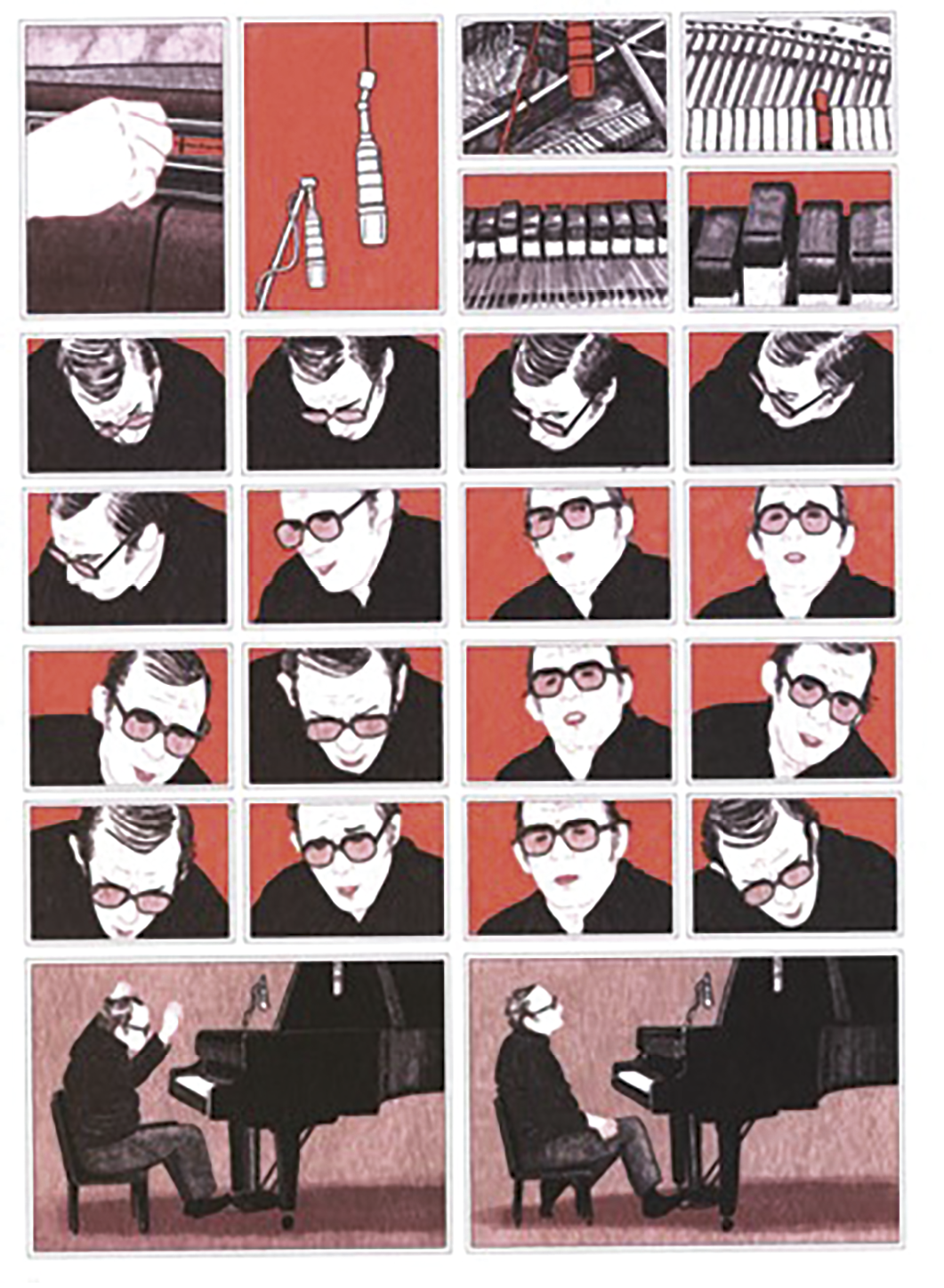 El recurso de multiplicar las viñetas para representar la ejecución de una pieza de piano busca producir un efecto de énfasis, una especie de ralentización en la enunciación narrativa que suspende el desarrollo de la trama en función de la representación perceptiva de la melodía, pero de forma sutil y elegante, sin recurrir a onomatopeyas aparatosas ni a representaciones icónicas que interrumpan la atmósfera contemplativa y ensimismada que caracterizaba, por cierto, la interpretación de Gould.