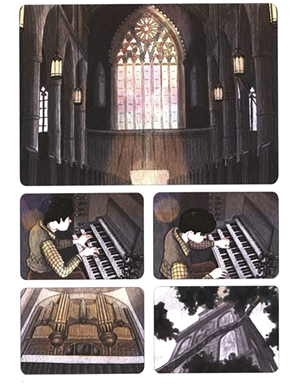 Esta idea de la repetición modulada se compagina con figuras retóricas como la metonimia o la metáfora, siempre a través de los media affordances de la secuencia misma. En la figura 3, la plancha propone una secuencia que revela fragmentos de un órgano en una iglesia y representa, en solo dos viñetas, a un joven Gould tocando. De algún modo, la escena completa está imbricada de una música que no aparece notada explícitamente en las imágenes, pues la página entera es, a su modo, una secuencia: “To cut up a text is to scan it. The ‘text’ of comics obeys a rhythm that is imposed on it by the succession of frames —a basic heartbeat that, as is seen in music, can be developed, nuanced, and recovered by more elaborate rhythmic effects stressed by other ‘instruments’ (parameters), like those of the distribution of word balloons, the opposition of colors, or even the play of the graphic forms” (Groensteen 45).