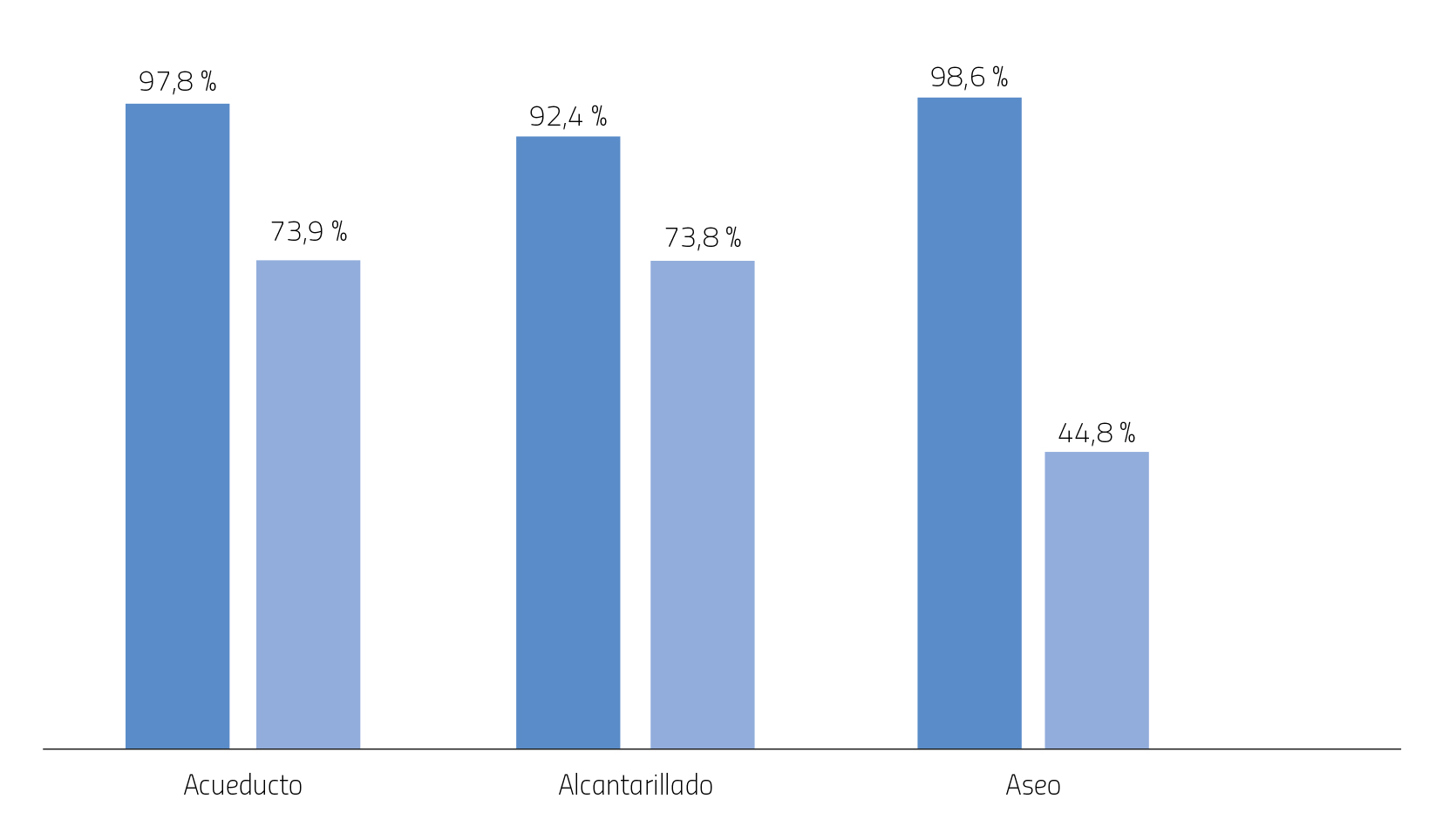 En Colombia, el sector de Agua Potable y Saneamiento Básico (APSB) ha registrado avances importantes de cara a la agenda de los ODS al 2030 y el Acuerdo de París (COP21). Las coberturas urbanas de los servicios han aumentado por encima del 90 %. Sin embargo, persiste una brecha urbano-rural superior al 20 % (Figura 1), (DNP, 2019). Pero las cifras no evidencian si la cobertura registrada da cuenta del consumo de agua de buena calidad. Según el INS, para el año 2013, se estimó que el 79 % de los 11.608 sistemas de agua rurales no proporcionaban agua con calidad satisfactoria. Adicionalmente, los datos de cobertura también son discutibles. Según Ruiz Ruiz et al. (2018), quienes analizaron estudios sectoriales de la Contraloría Delegada para el Sector Social, indicaron la poca confiabilidad que brinda la información reportada a través del Sistema Único de Información (SUI) de la Superintendencia de Servicios Públicos Domiciliarios (SSPD). A su vez, el DANE en 2018 reportó brechas en cobertura de acueducto urbano y rural entre los años 2008 y 2017 que varían entre el 36,5 % y el 35,6 %, superiores a las reportadas por el DNP en 2019.