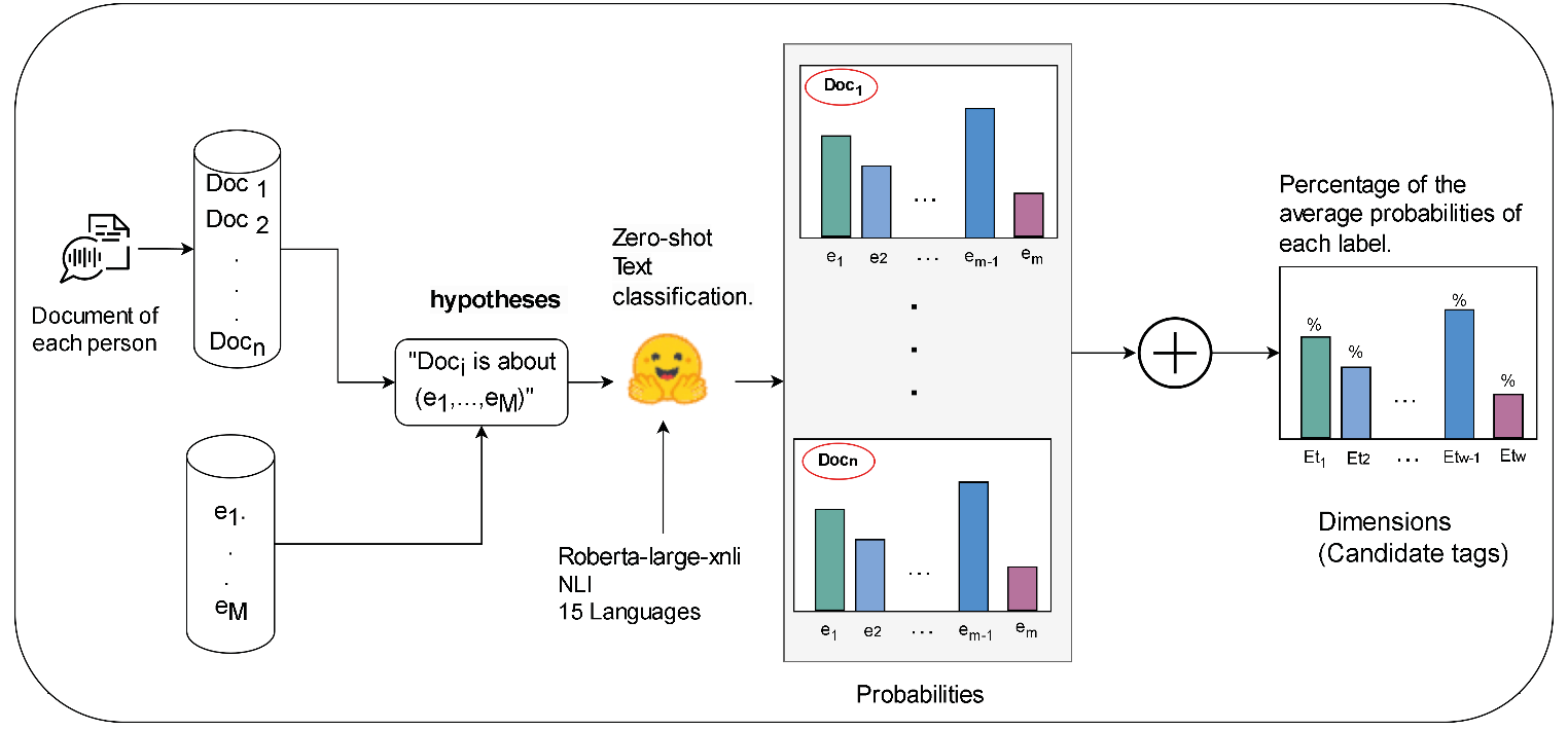 The 0Shot-TC technique (Figure 3) operates on two principles: (i) partially unseen labels (restrictive definition) and (ii) completely unseen labels (open definition). Our problem aligns with the second principle (Yin, Hay, and Roth 2019). We begin by processing each person’s text documents to generate hypotheses such as “This document is about [candidate labels].” These hypotheses are evaluated using the multilingual Roberta-large-xnli NLI model to assign probabilities to each label. The goal is to simulate human reasoning by constructing a classifier that responds to these hypotheses. For example, to determine whether a text relates to “poverty,” we use the hypothesis “This is a text about poverty.” Aggregating these probabilities calculates the average percentage for each label, offering a comprehensive understanding of the candidate labels present. This method provides a flexible way to interpret and classify semantically similar concepts without prior specific training.