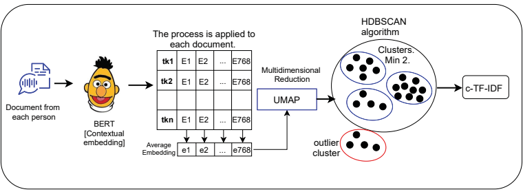 The BERTopic algorithm (Grootendorst 2020) illustrated in Figure 2 addresses the limitations of the bag-of-words approach by leveraging BERT-based contextual embeddings (Devlin et al. 2019) combined with average pooling, dimensionality reduction via UMAP, cluster analysis using HDBSCAN, and an adapted Tf-Idf method (Salton and Buckley 1988). It uses Sentence-BERT (Reimers and Gurevych 2019) to create a single vector per document through mean pooling. This approach facilitates the extraction of meaningful clusters, including the identification of outliers. For cluster interpretation, BERTopic implements cluster Tf-Idf (c-Tf-Idf) to identify key tokens within each cluster. Notably, BERTopic does not need to predefine the number of clusters, increasing its generality and reducing bias.