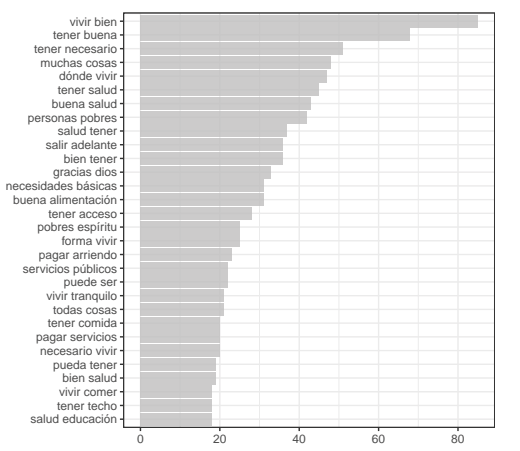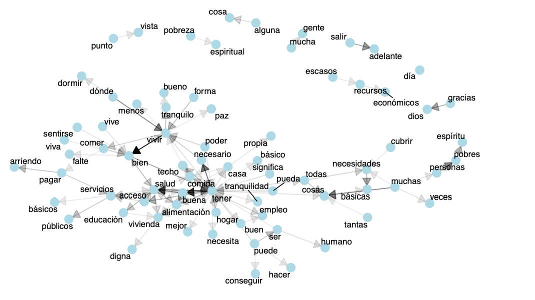 The descriptive analysis revealed the diversity of domains where people focused their concern, for example, on the important role of having somewhere to live for poor people and living well as a point of reference for quality of life. Figure 4 adds information to the bigram counts to analyze the most important domains in the poverty and QoL corpus, respectively. Notice the systematic occurrence of concepts like tener casa (having a place to live), tener empleo (to have employment), salir adelante (getting ahead), tener una buena salud (to have good health), pobre de espíritu (poverty of spirit), and others.