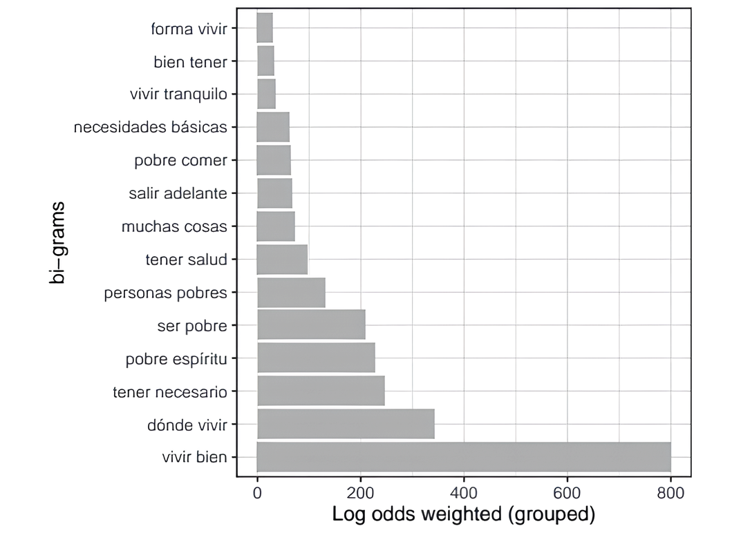 For the descriptive analysis, we also calculated the log-odds ratio weighted by a prior (Monroe, Colaresi, and Quinn 2017) to account for sampling variability in the databases. Figure 7 presents the weighted log-odds for documents in the poverty and QoL databases. The results are consistent with the ones obtained in the co-ocurrence approach. From the perspective of the capability approach, these two findings suggest a strong internal consistency within each corpus—that is, documents in the poverty database tend to reflect similar concerns, as do those in the QoL database. This indicates overlapping social values or a shared understanding of the most important aspects of life. According to the weighted log-odds results shown in Figure 7, the most prominent bigram in the poverty database is tener casa (having a place to live), followed by the bigram falta de dinero (lack of money). In the QoL database, the most important bigram is vivir bien (living well), followed by dónde vivir (where to live).
