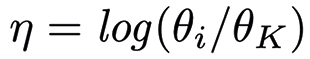 The topics in a text are defined as \( \beta \), therefore a set with \( K \) topics can be denoted as \( \beta_{1:K} \). Additionally, each document \( d \) is associated with a topic proportions \( \theta_d \), i.e., it is the distribution over topic indices and reflects the probability for the corresponding set of words to be drawn from each topic in the collection. The logarithmic quotient between the proportion of the \( i \)-th document with respect to the proportion over the whole \( K \) documents is given by
