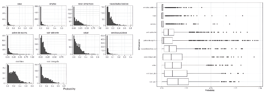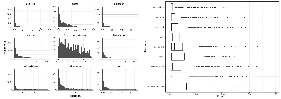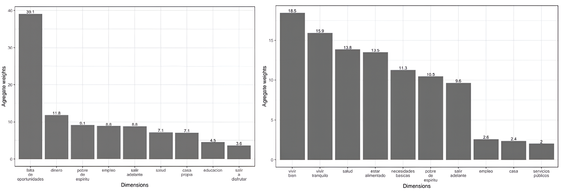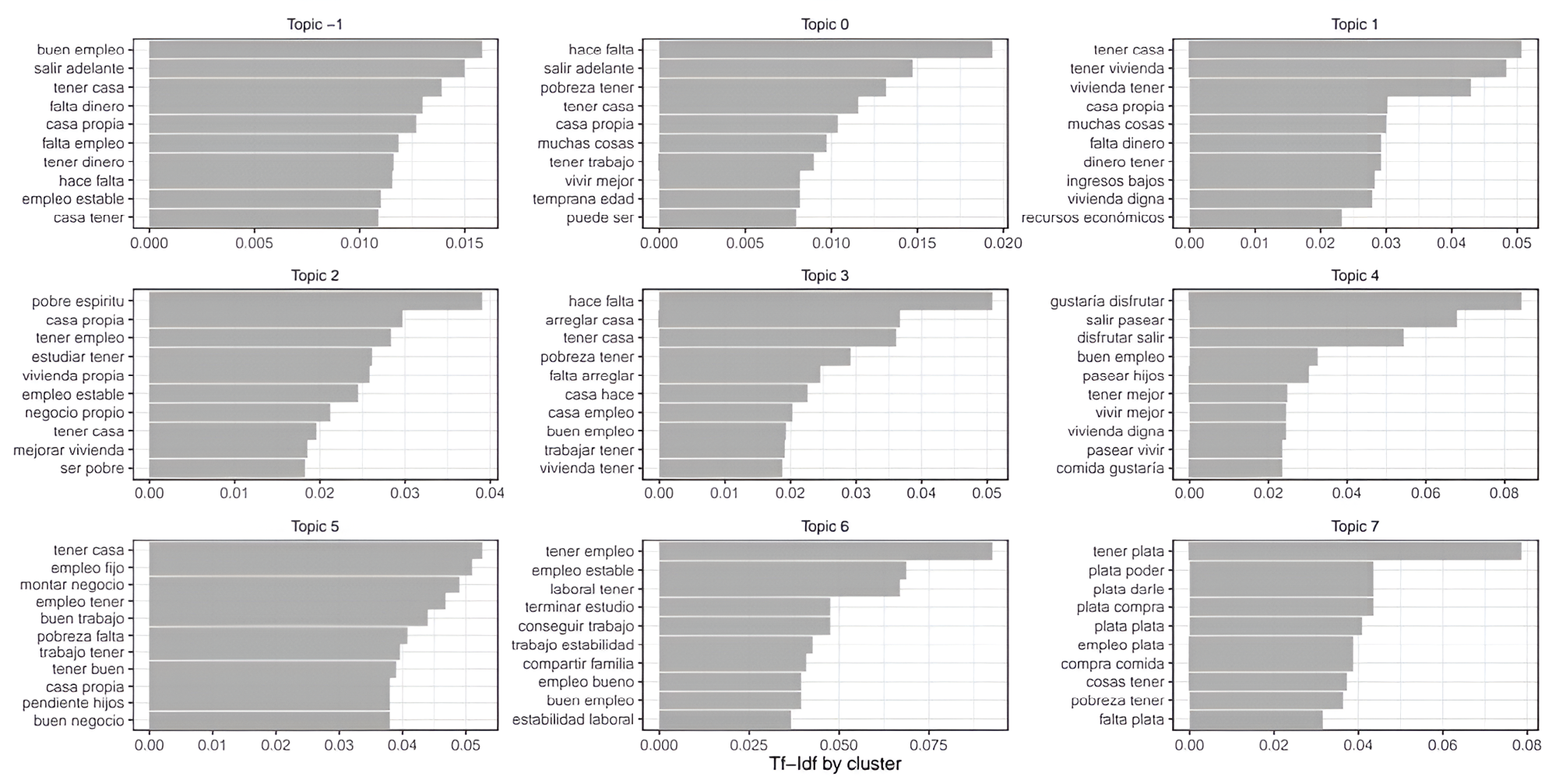 In sum, the candidate labels extracted with CTM are: owning a house, having a job, getting ahead, lack of opportunities, lack of money or resources, wanting to enjoy life, better life, going out to visit places, poverty of spirit, and health. Therefore, the candidate dimensions selected were: casa propia (owning a house), empleo (employment), salir adelante (getting ahead or progressing), falta de oportunidades (lack of opportunities), falta de dinero o recursos (lack of money or resources), pobre de espíritu (poverty of spirit), salud (health), deseo disfrutar (wanting to enjoy life). Note that this last dimension is a bigram related to salir a pasear (going out to visit places).