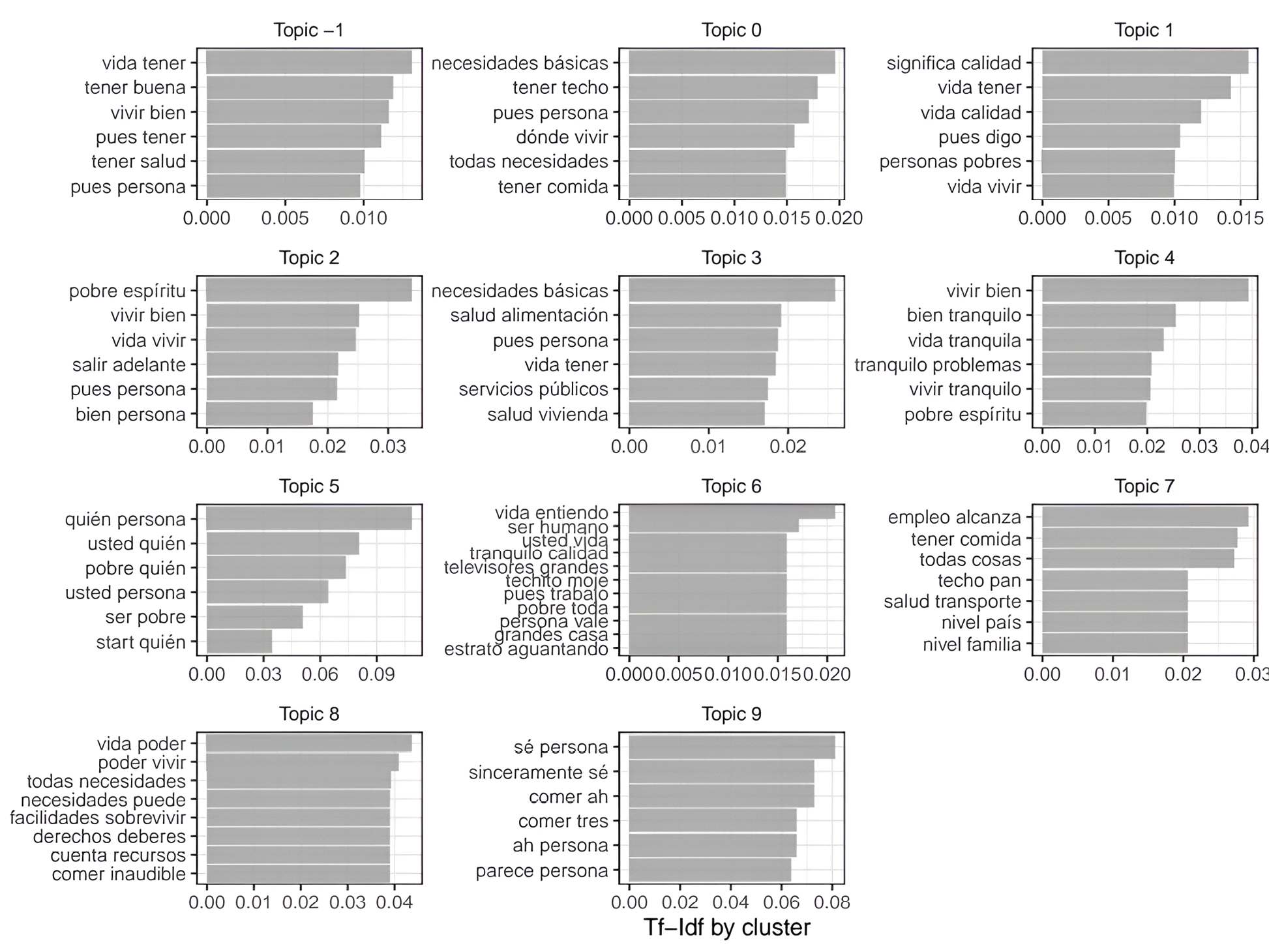 The top bigrams in the poverty database using k=6 topics confirm findings from the counting approach. The topics are correlated with no clear distinctions among them. Bigrams with the highest probabilities relate to owning a house and employment (Topics 2, 3, and 4). General aspects like salir adelante (getting ahead), interpreted as progressing, also appear. Additionally, falta de oportunidades (lack of opportunities) emerges in the top bigrams across all topics. An important aspect highlighted by poor individuals is the lack of money, resources, or income (falta de dinero, recursos o ingresos). Specific bigrams include deseo disfrutar (wanting to enjoy life) (Topics 2, 3, 4), mejor vida (better life) (Topics 1, 3), and salir a pasear (going out to visit places) (Topic 4). With lower co- occurrence and probability, the concepts pobre de espíritu (poverty of spirit) appear in topics 1 and 5, and buena salud (good health) in topic 4.