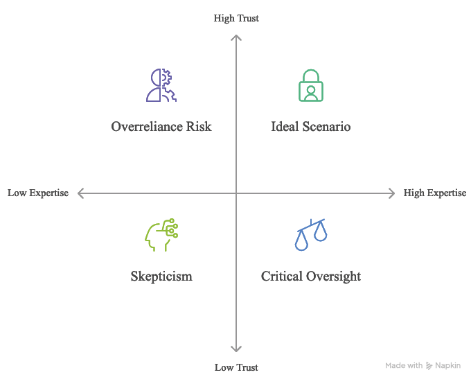 Source: Image generated by Napkin AI based on the author-provided text description, depicting the diverse scenarios of trust and experience in AI systems showing the undesirable outcomes of overreliance and dependency created on November 15th, 2024.