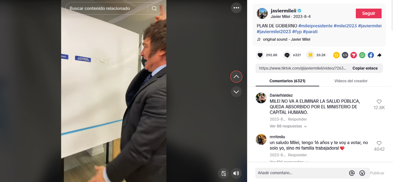 Las publicaciones en la cuenta oficial son escasas y no utilizan videos con la lógica de TikTok, los cuales suelen mezclar humor, entretenimiento y música (Ariza et al. 2023). No obstante, eso no les impide acumular millones de vistas; aunque sí llama la atención que una personalidad que tuvo éxito en la televisión tradicional, y que tiene un estilo polémico propio de las dinámicas de viralización, no explote esas mismas cualidades en una plataforma tan importante como TikTok, más aún si se toma en cuenta que dicha plataforma es de las más utilizadas por los jóvenes, base de apoyo importante para Milei. También llama la atención que, prácticamente, no hay menciones a su partido, lo que confirma el protagonismo del líder argentino.