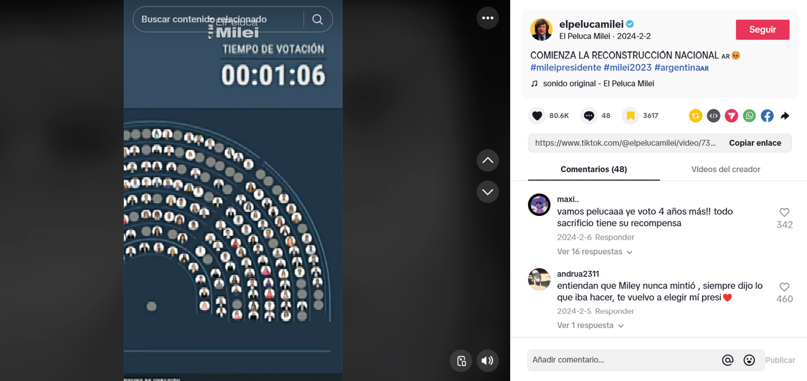 Por último, el video del 3 de marzo de 2024 es un fragmento del discurso dado por el presidente en el que hace un llamado a la clase política que “no quieren abandonar los privilegios del antiguo régimen”, a la vez que enuncia a los que considera que buscan dañar a su gobierno y a la sociedad argentina. El video cierra con una edición de audio en la que se insertan ruidos de aplausos, mientras Milei comenta “que si lo que buscan es el conflicto, conflicto tendrán” (@elpelucamilei en TikTok, 3 de marzo de 2024).
