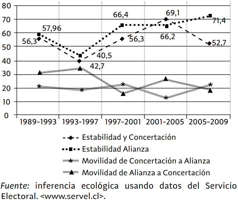 Al igual que para el período 1953-1973, usamos el método de inferencia ecológica para estimar la estabilidad de las preferencias electorales de las mujeres (ver la gráfica 7). Dado que los análisis de gender gap muestran una relativa erosión del conservadurismo electoral y una mayor tendencia de la mujer a apoyar a la coalición de centroizquierda, deberíamos encontrar un movimiento de votos de la Alianza a la CPPD.[36] La estimación muestra que el voto de las mujeres por la Alianza es el más estable en el tiempo, mientras que las votantes de la CPPD también muestran alta estabilidad, con un alza significativa entre 2001 y 2005. Sin embargo, estas dos principales coaliciones sufrieron una caída considerable en su apoyo entre 1993 y 1997, lo que se explica por la alta abstención y cantidad de votos nulos y blancos que se emitieron en 1997. Este análisis de movilidad electoral confirma los indicios de la erosión del gender gap conservador, ya que, en promedio, es más factible que una votante de la Alianza lo haga por la Concertación, y no al revés, con la salvedad de la elección de 2001, donde fueron más las votantes de la CPPD que optaron por un candidato de derecha, en comparación con la elección anterior. En 2009, la movilidad fue muy similar entre ambas coaliciones.
