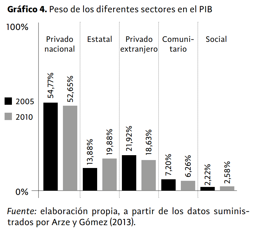 En 2005, antes de la toma de posesión del gobierno del MAS, el sector comunitario y el estatal ocupaban aproximadamente el 8% y 14% del PIB, respectivamente, mientras que el sector privado tenía una presencia absoluta del 54% (Arze y Gómez 2013, 100). Bajo estas circunstancias de hegemonía capitalista y debilidad estatal y comunitaria, el gobierno de ideología izquierdista ha impulsado continuamente un papel activo del Estado en la economía a través de las nacionalizaciones de empresas privatizadas en la época neoliberal, como en el caso de los Yacimientos Petrolíferos Fiscales Bolivianos (YPFB), e incrementado las tasas de impuestos a las compañías transnacionales en sectores estratégicos como el de los hidrocarburos (Kaup 2010, 128).