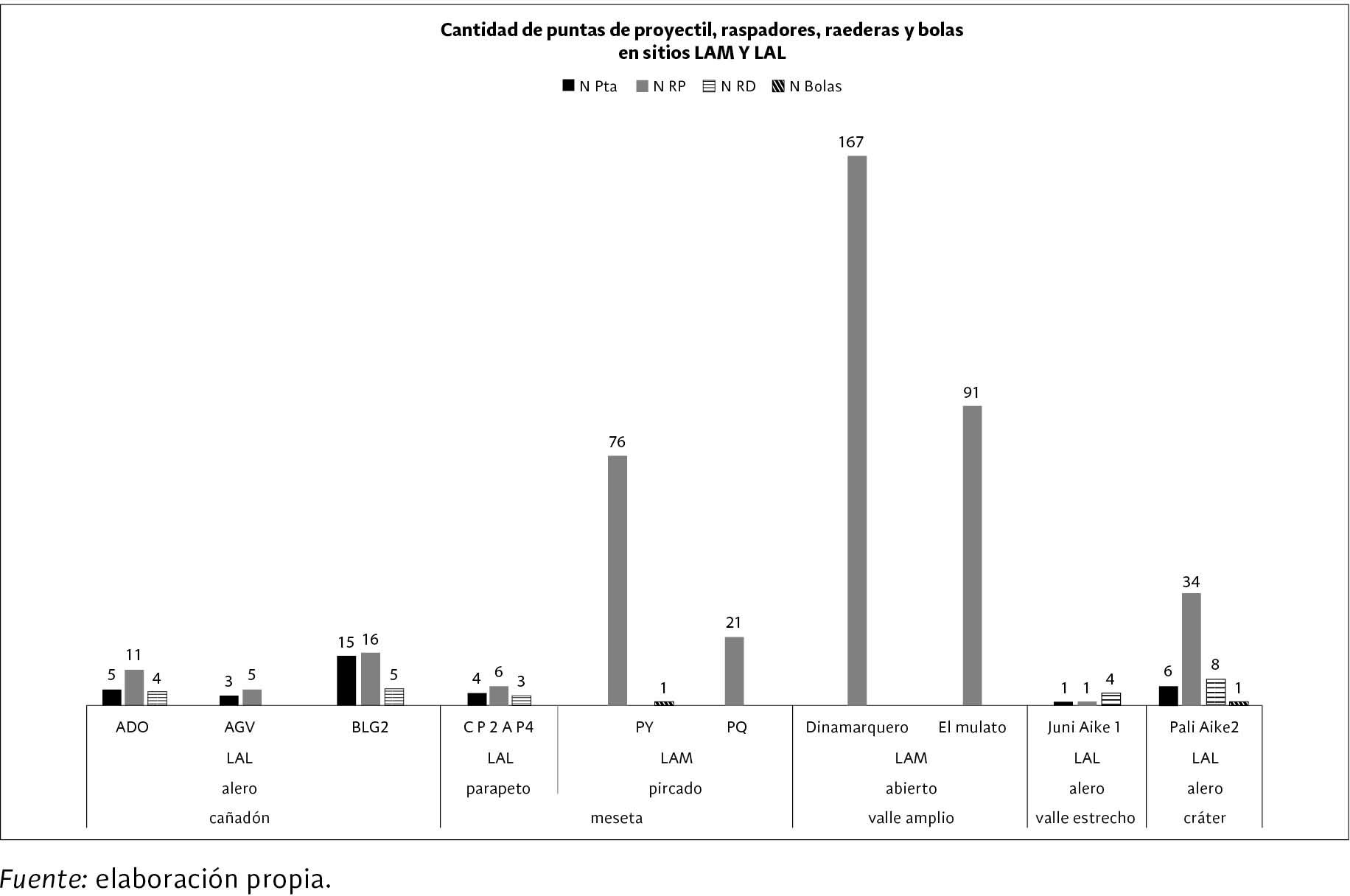 De esta manera, se propuso analizar comparativamente las frecuencias de puntas de proyectil, junto con dos tipos artefactuales: los raspadores y las raederas (Aschero 1975; 1983). El objetivo de tal comparación radicaba en comprender si existía una correlación entre la presencia de puntas de proyectil y la funcionalidad asignada a estos sitios, esperando una baja cantidad de raspadores y raederas en localidades de actividades limitadas (LAL) (Borrero 1987).