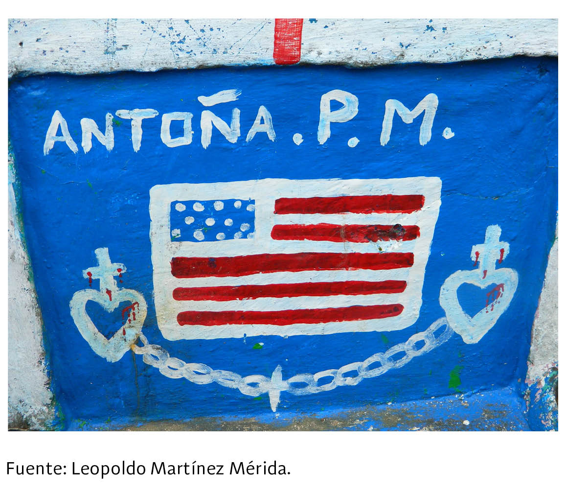 Las palabras de Mario, dirigidas a su comunidad y pronunciadas con orgullo desde el balcón de una casa construida con remesas, permiten entender con más claridad la apreciación colectiva de las construcciones de block, y nos ayudan a mirar con ojos distintos el elemento más desconcertante: la bandera de Estados Unidos. Como sostiene Manuela Camus (AECID 2010, 62-63), la bandera, más allá de ser un símbolo nacionalista, es un objeto de marketing en los contextos transnacionales, una mercancía que genera una ganancia y que, por lo tanto, permanece a disposición del que la compra. Esta es su fuerza y a la vez su debilidad: permite su expansión más allá de las fronteras de EE. UU., pero se expone al uso que de ella hacen los consumidores. En Todos Santos se puede encontrar manchada de lodo en la camisa arrugada del campesino, convertida en un objeto trivial de la cocina, diseñada en la fachada de casas incompletas, o junto a nahuales y decoraciones floreales. Es una bandera que puede ser despojada de su carácter ceremonial, que puede ser reciclada y humanizada. Puede ser usada, por ejemplo, para narrar la migración como una táctica de afirmación personal, como un sacrificio hecho para beneficiar a la familia o a la comunidad. En este sentido, expresa el sentimiento de agradecimiento hacia los Estados Unidos, lugar donde el migrante ha vivido la fase liminar de un rito de pasaje que lo ha hecho miembro adulto de su comunidad, capaz de mejorar sus propias condiciones materiales y elevar el estatus en su tierra de origen.